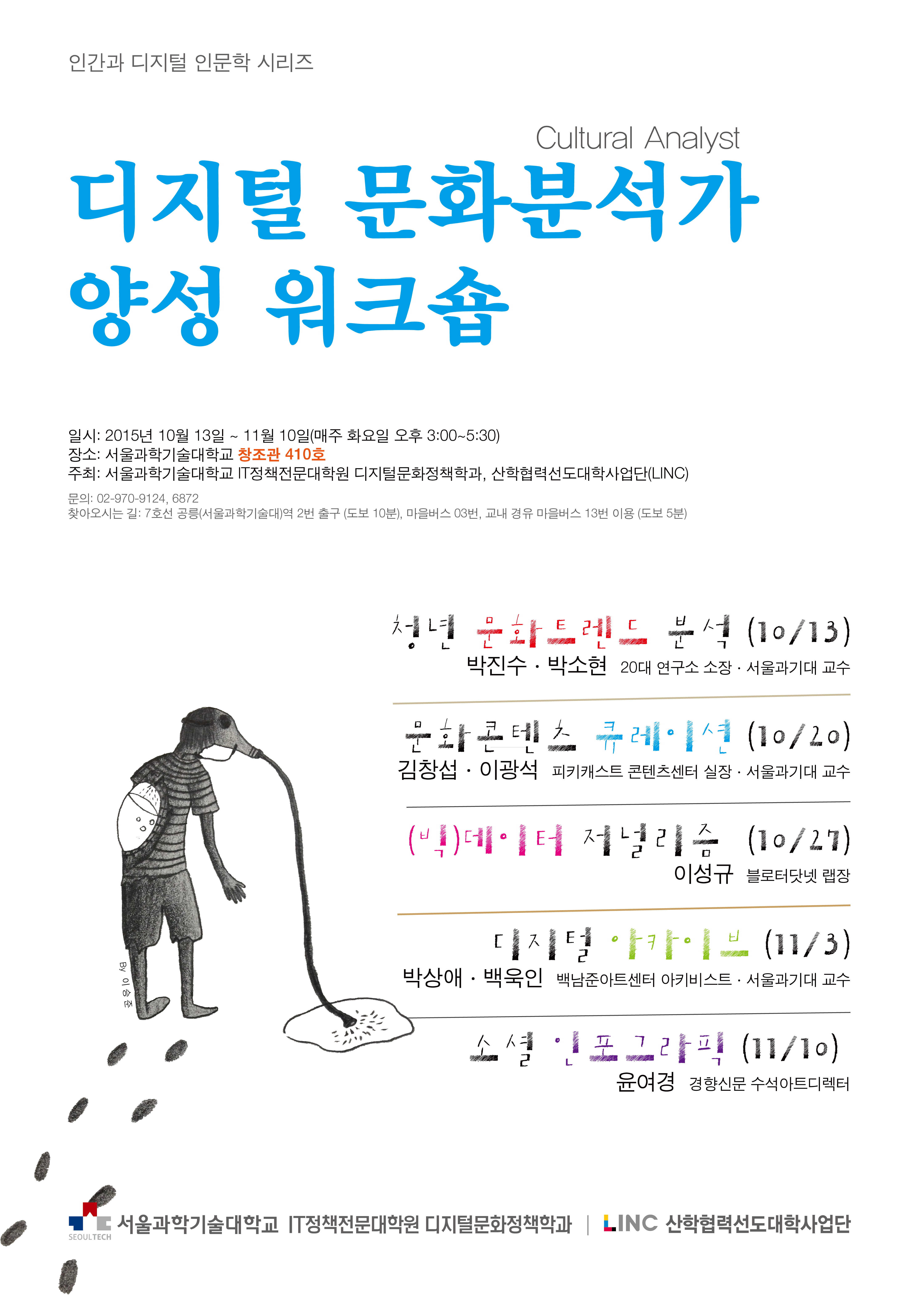 2) 취지: 일상의 창작과 문화 소비가 대규모로 발생하고 유통되는, 소위 스마트 문화현실에 우리는 살고 있습니다. 이를 기록하고, 정리하고, 편집하고, 분석하고, 시각화하고, 트렌드를 읽는 일이 그 어느 때보다 중요해져 갑니다. 그럼에도 불구하고 이를 분석할 고급 인력들은 태부족인 실정입니다. 이에 디지털 문화와 인문학 영역의 현업 전문가들을 모시고, 현재 부상하는 영역들, 문화 트렌드 분석, 빅데이터 문화 분석, 문화콘텐츠 큐레이션, 디지털 아트 아카이브, 인포그래픽 등에서 응용 가능한 분석 기법과 현황을 이해할 수 있는 기회를 마련하고자 합니다. 이 워크숍은 디지털 문화 현상의 다양한 분석 기법들과 향후 디지털 문화 트렌드에 관심을 공유하시는 모든 분들에게 열려있습니다. 강좌는 무료로 진행될 예정입니다. 관심 있는 분들의 많은 참여를 바랍니다.