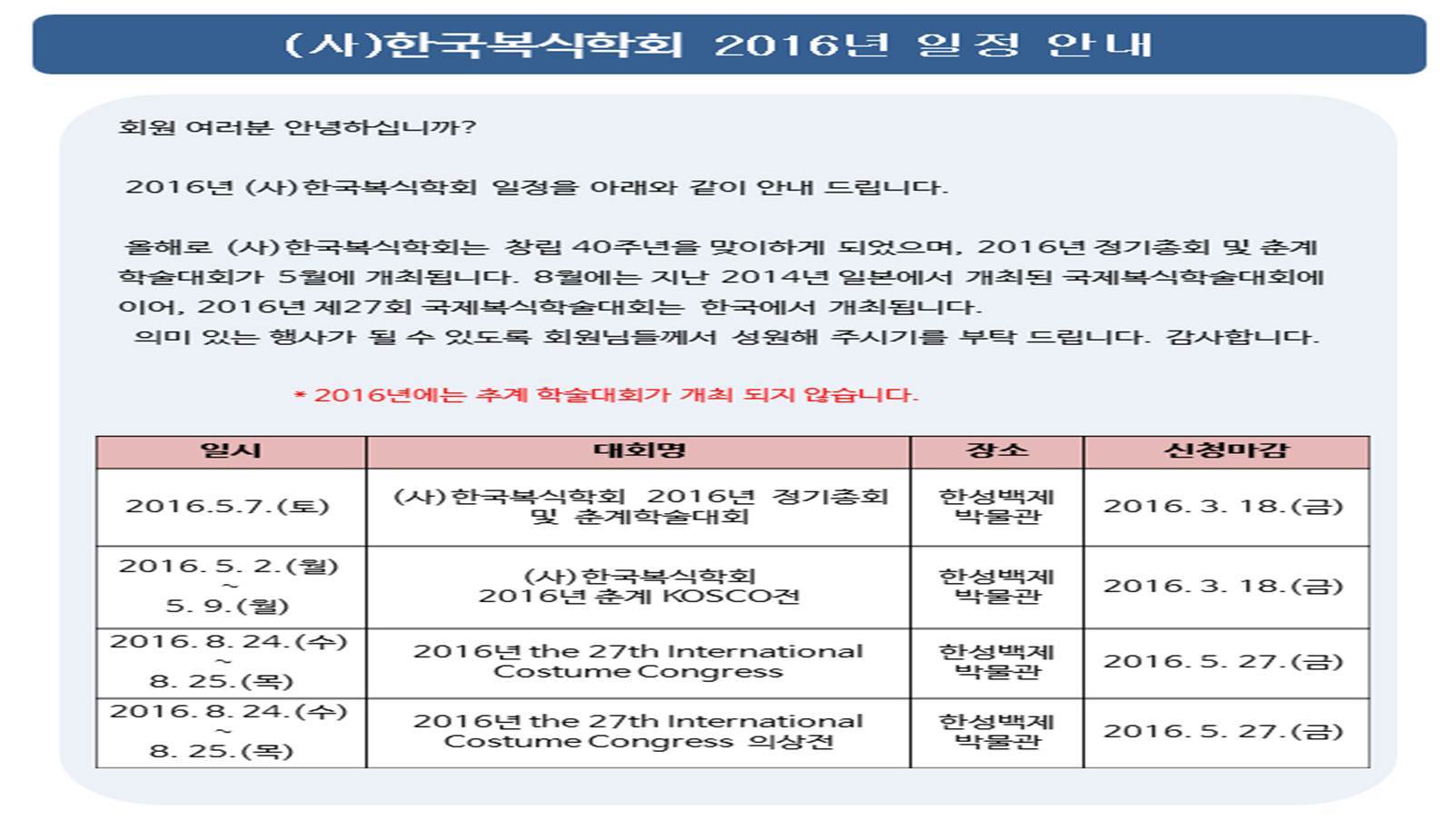 2016년 (사)한국복식학회 일정안내