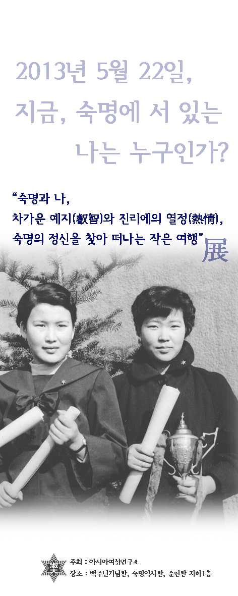 -  2013년 5월 숙명 창학주간에 맞추어 근현대를 잇는 총체적 시각에서 숙명의 역사를 100주년기념관 1층 숙명 역사관 로비에서 전시할 예정. 구체적으로 전시는 숙명역사관(제1전시관)을 출발로 역사관 로비에 새로 제2전시관을 만들고 3파티션으로 하여 위에 제시한 사진들을 3단계화하여 전시될 예정, 이후 도서관 1, 2층 및 순헌관 지하1층 로비에 사진전 투어가 방학기간 동안 이루어질 예정