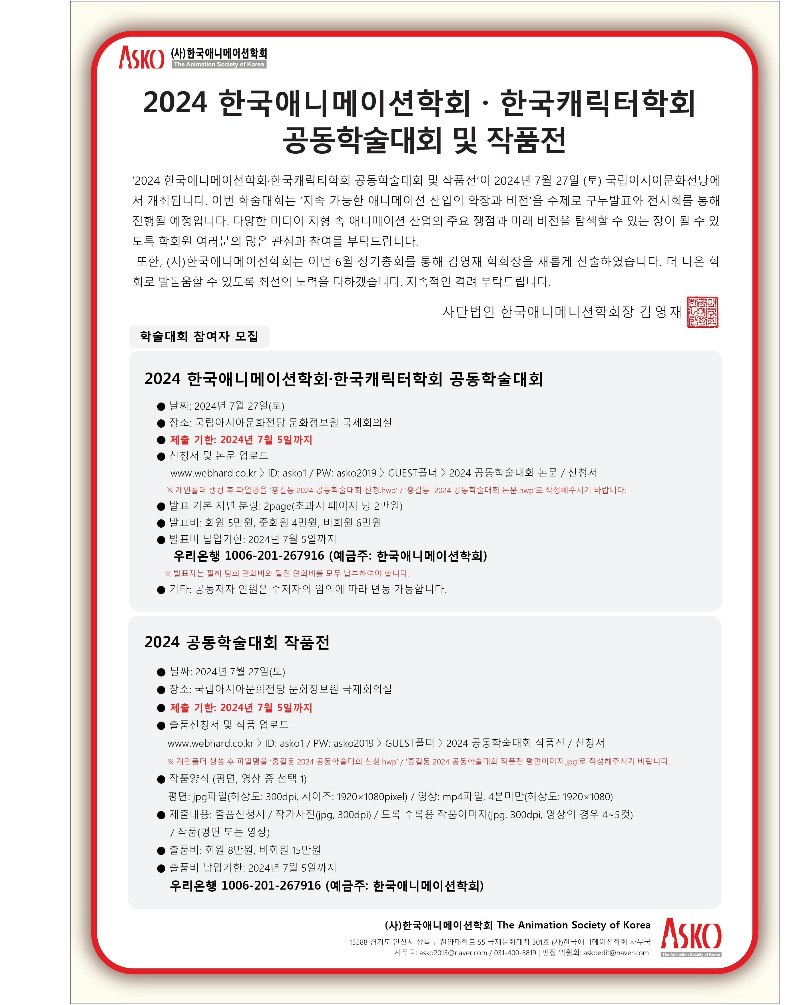 2024 한국애니메이션학회·한국캐릭터학회 공동학술대회 및 ASKO작품전 신청 및 작품 제출 기한연장 안내(7/10 마감)