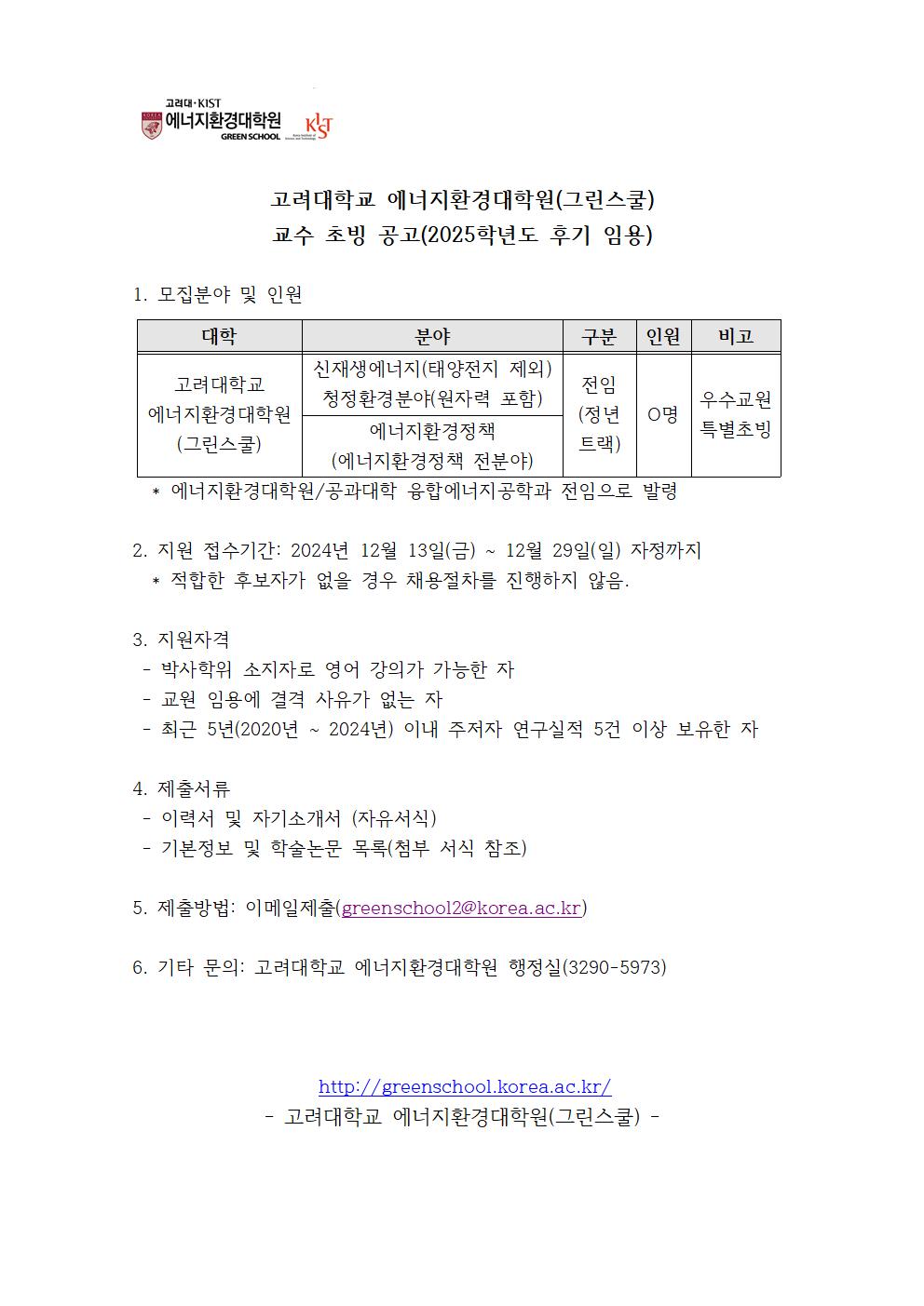 [채용] 고려대학교 에너지환경대학원(그린스쿨) 교수초빙 공고