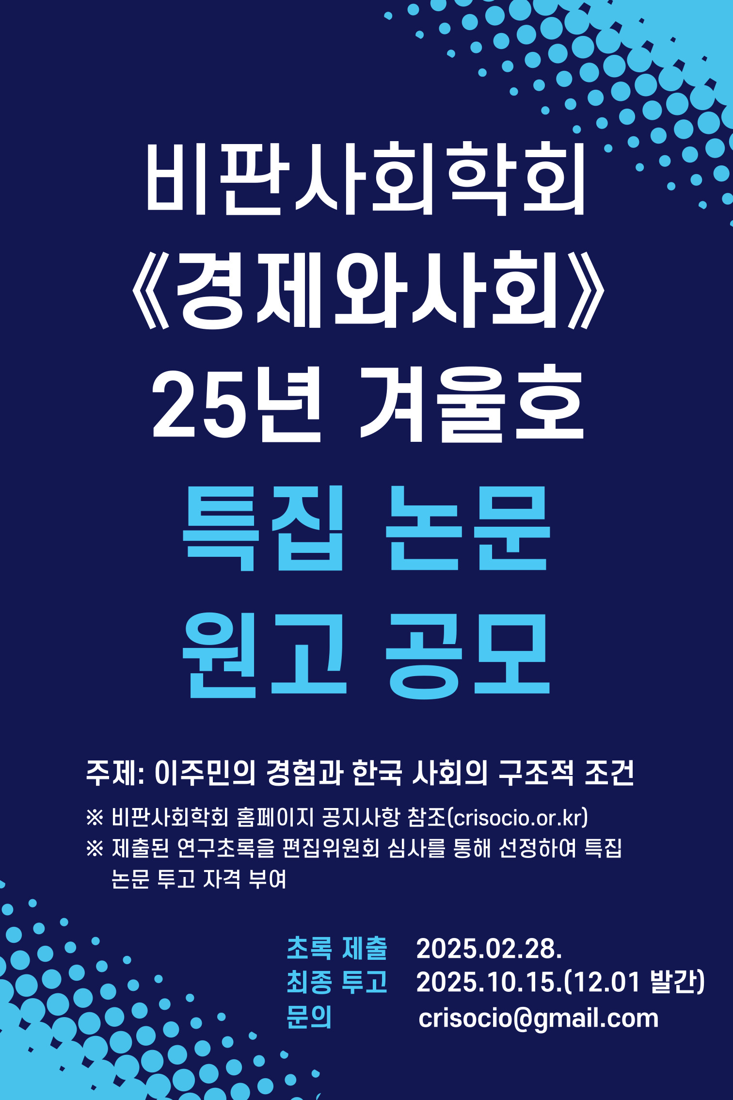 ≪경제와사회≫ 제148호(2025년 12월 발간 예정) 특집논문 원고 공모 내용을 안내드립니다.