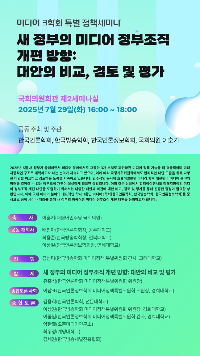 1. 회원 여러분의 건승을 기원합니다. 2. 미디어 3학회(한국언론학회, 한국방송학회, 한국언론정보학회)는 오는 7월 29일(화) <새 정부의 미디어 정부조직 개편 방향: 대안의 비교, 검토 및 평가>를 주제로 다음과 같이 특별 정책세미나를 개최합니다. 회원 여러분의 많은 관심과 참여를 부탁드립니다. ◀ 다 음 ▶ □ 세미나 주제: 새 정부의 미디어 정부조직 개편 방향: 대안의 비교, 검토 및 평가 □ 기획 의도 2025년 6월 새 정부가 출범하면서 미디어 분야에서도 그동안 3개 부처로 파편화된 미디어 정책 기능을 더 효율적이며 미래지향적인 구조로 개혁하고자 하는 논의가 지속되고 있으며, 이에 따라 국정기획위원회에서도 합리적인 대안 도출을 위해 다양한 대안을 비교하고 검토하는 노력을 지속하고 있습니다. 민주적인 동시에 효율적일뿐만 아니라 향후 대한민국 미디어 분야의 미래를 열어갈 수 있는 정부조직 개편이 절실하게 필요한 상황입니다. 이와 같은 상황에서 합리적이면서도 미래지향적인 미디어 정부조직 개편 대안을 도출하기 위해서는 다양한 대안과 의견에 대한 비교, 검토 및 평가를 통해 신중한 결정이 필요한 상황입니다. 이에 국내 미디어 분야의 대표적인 학자그룹인 미디어 3학회(한국언론학회, 한국방송학회, 한국언론정보학회)를 중심으로 정책 세미나 개최를 통해 새 정부의 바람직한 미디어 정부조직 개편 대안을 논의하고자 합니다. 관심있는 회원 여러분의 많은 참여를 부탁드립니다. □ 세미나 개요 - 일시: 2025년 7월 29일(화) 16:00~18:00 - 장소: 국회의원회관 제2세미나실/Youtube 온라인 중계 - 주제: 새 정부의 미디어 정부조직 개편 방향: 대안의 비교, 검토 및 평가 - 주최/주관: 한국언론학회, 한국방송학회, 한국언론정보학회, 국회의원 이훈기 □ 세부 프로그램