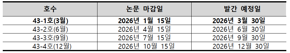 ⦁ 제43-1호 논문 투고는 2026년 1월 15일 마감입니다. <사이버커뮤니케이션학보>는 수시접수를 원칙 으로 하고 있으며 호별 논문 마감일과 발간 예정일은 아래와 같습니다. 연구자 여러분들의 많은 관심과 참여 부탁드립니다.
