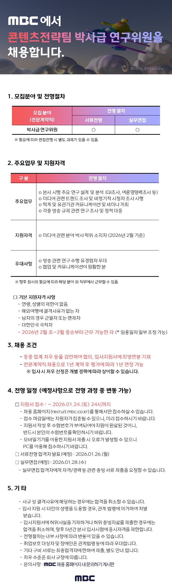 2. MBC 인사팀의 요청으로 박사급 연구원 채용 공고와 관련한 내용을 다음과 같이 안내드립니다.