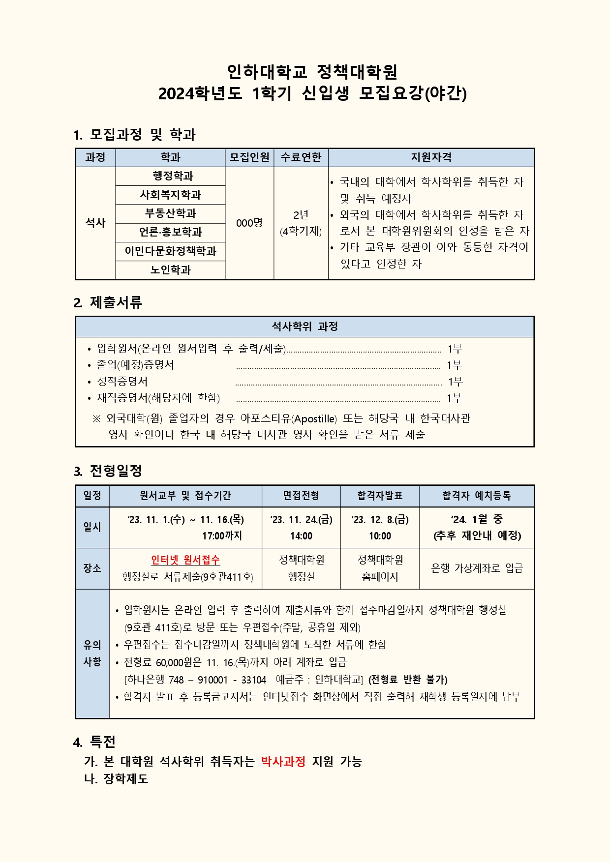 2. 인하대학교 정책대학원(야간) 2024학년도 1학기 신입생 모집을 다음과 같이 안내해 드리니, 회원 여러분의 많은 관심 바랍니다.