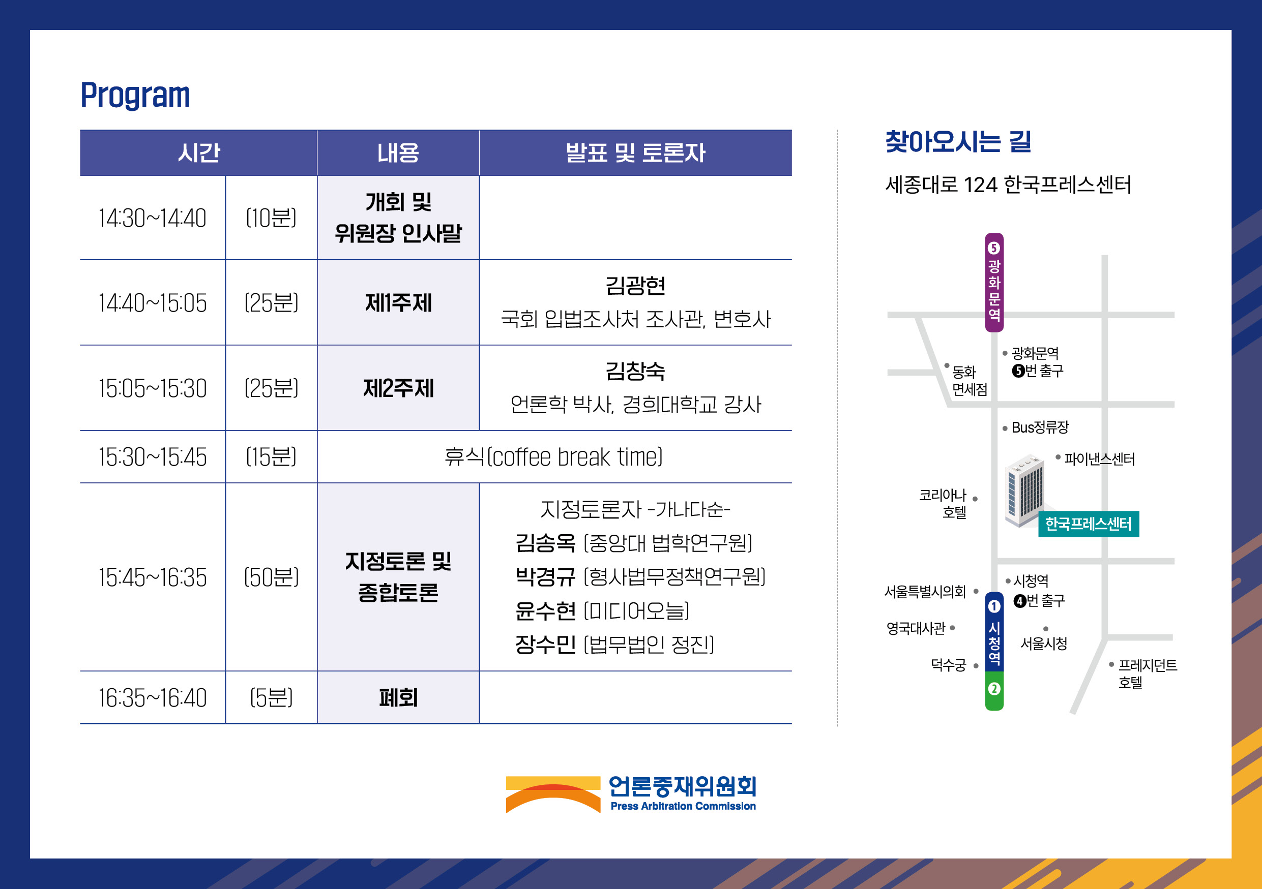 * 참석을 희망하시는 분들께서는 사전 좌석 세팅 등을 위하여 언론중재위원회 연구팀(02-397-3041~4)로 사전에 연락 주시면 감사하겠습니다.