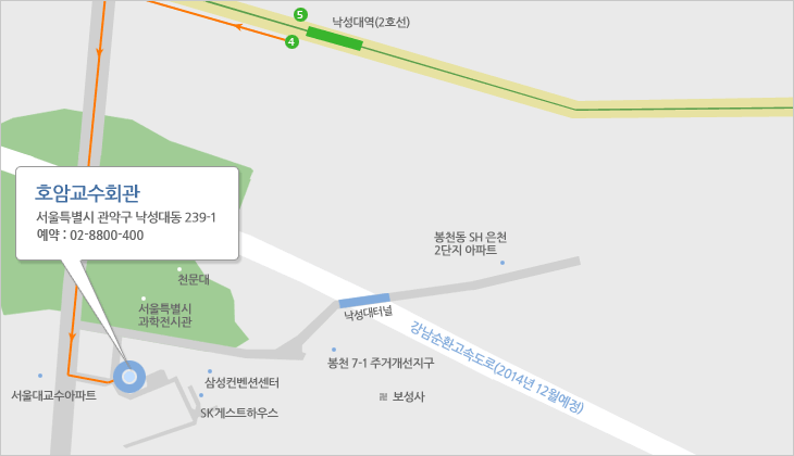 서울지하철 2호선 낙성대역 4번 출구 → GS주유소 → [장블랑제리]제과점 앞에서 마을버스 [관악-02번] 승차 → 호암교수회관 하차(5분거리)