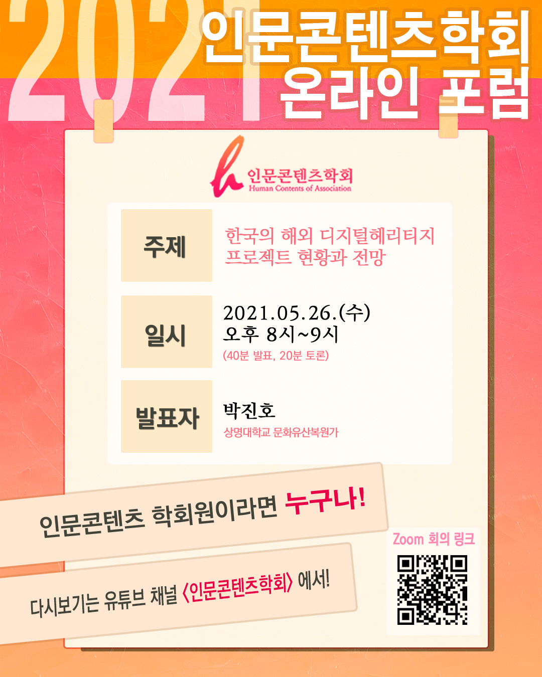 5월 26일 수요일 20시에 진행하는 2021 인문콘텐츠학회 온라인 포럼 안내공지 입니다.