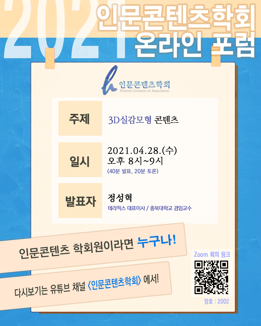4월 28일 수요일 20시에 진행하는 2021 인문콘텐츠학회 온라인 포럼 안내공지 입니다.