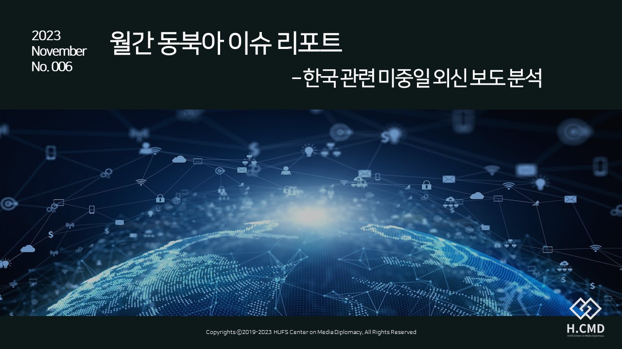 2. 한국외대 미디어외교센터(H.CMD)에서 <동북아 이슈 리포트> 6호(11월호)를 다음과 같이 발간하였습니다. 회원님들의 많은 관심과 참여 바랍니다.