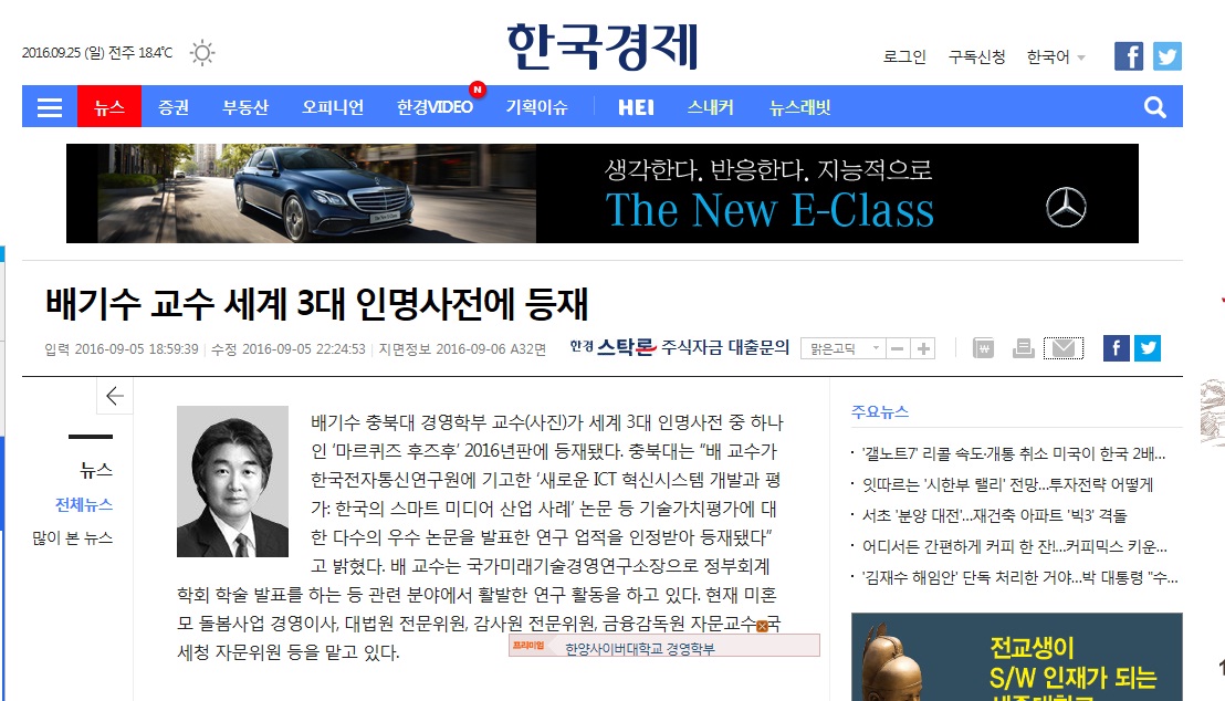 배기수 충북대 경영학부 교수(사진)가 세계 3대 인명사전 중 하나인 ‘마르퀴즈 후즈후’ 2016년판에 등재됐다. 충북대는 “배 교수가 한국전자통신연구원에 기고한 ‘새로운 ICT 혁신시스템 개발과 평가: 한국의 스마트 미디어 산업 사례’ 논문 등 기술가치평가에 대한 다수의 우수 논문을 발표한 연구 업적을 인정받아 등재됐다”고 밝혔다. 배 교수는 국가미래기술경영연구소장으로 정부회계학회 학술 발표를 하는 등 관련 분야에서 활발한 연구 활동을 하고 있다. 현재 미혼모 돌봄사업 경영이사, 대법원 전문위원, 감사원 전문위원, 금융감독원 자문교수, 국세청 자문위원 등을 맡고 있다(한국경제신문, 09/05 18:59 ).
