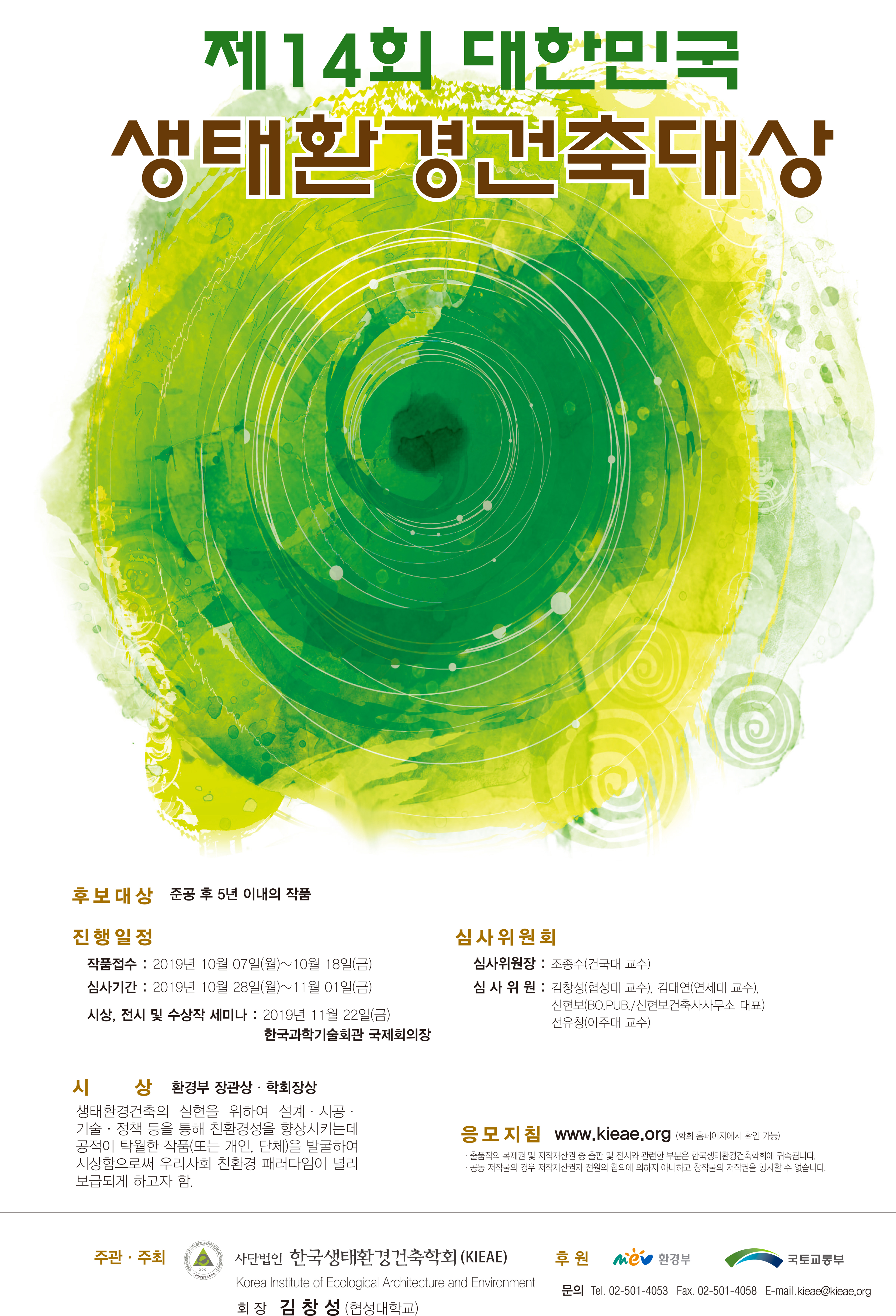 (사)한국생태환경건축학회에서는 2019년도 「제14회 대한민국 생태환경건축대상」을 오는 11월 22일(금) 한국과학기술회관에서 개최합니다. 대한민국 생태환경건축대상은 생태환경적인 건축의 실현을 위하여 설계적, 시공적, 기술적, 정책적 방법 등을 이용하여 건물의 친환경성을 향상시키는데 성과가 탁월한 작품(또는 개인, 단체)을 발굴, 시상하기 위하여 2006년도에 제정되었습니다. 우리 학회가 주최하고 환경부, 국토교통부에서 후원하는 「제14회 대한민국 생태환경건축대상」을 아래와 같이 개최하고자 하오니 본 행사에 많은 참여 바랍니다.