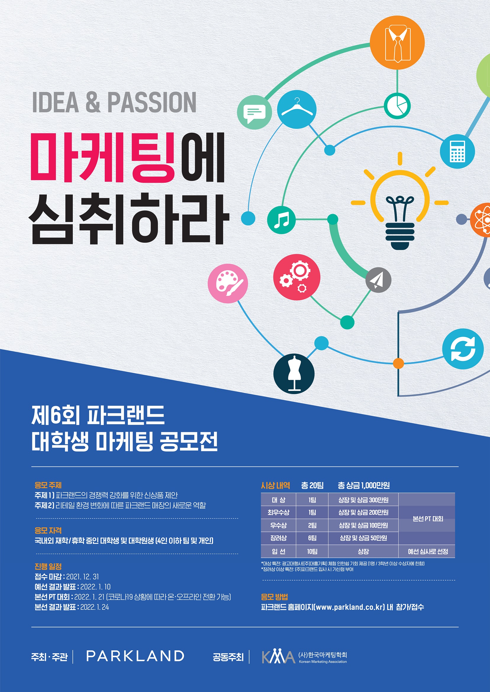 올해 공모전 주제는 파크랜드의 경쟁력 강화를 위한 신상품 제안과 리테일 환경 변화에 따른 파크랜드 매장의 새로운 역할마케팅에서 중요하게 다루는 부문이면서도 다양한 전공과의 협업이 기대되는 내용 또한 포함하고 있습니다.