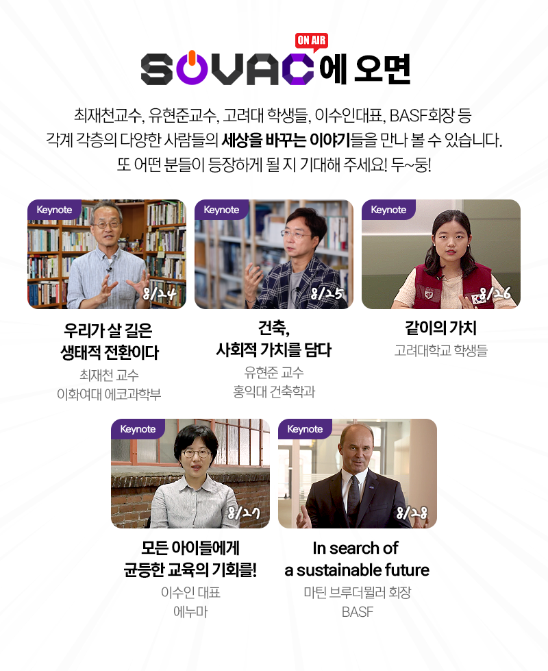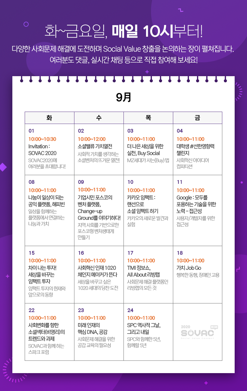이에 학회 여러분들께서는 SOVAC에 가입 후, 9월 매일 오전 10시부터 사회적 가치와 관련한 다양한 주제의 온라인 세션에 참가하실 수 있습니다.