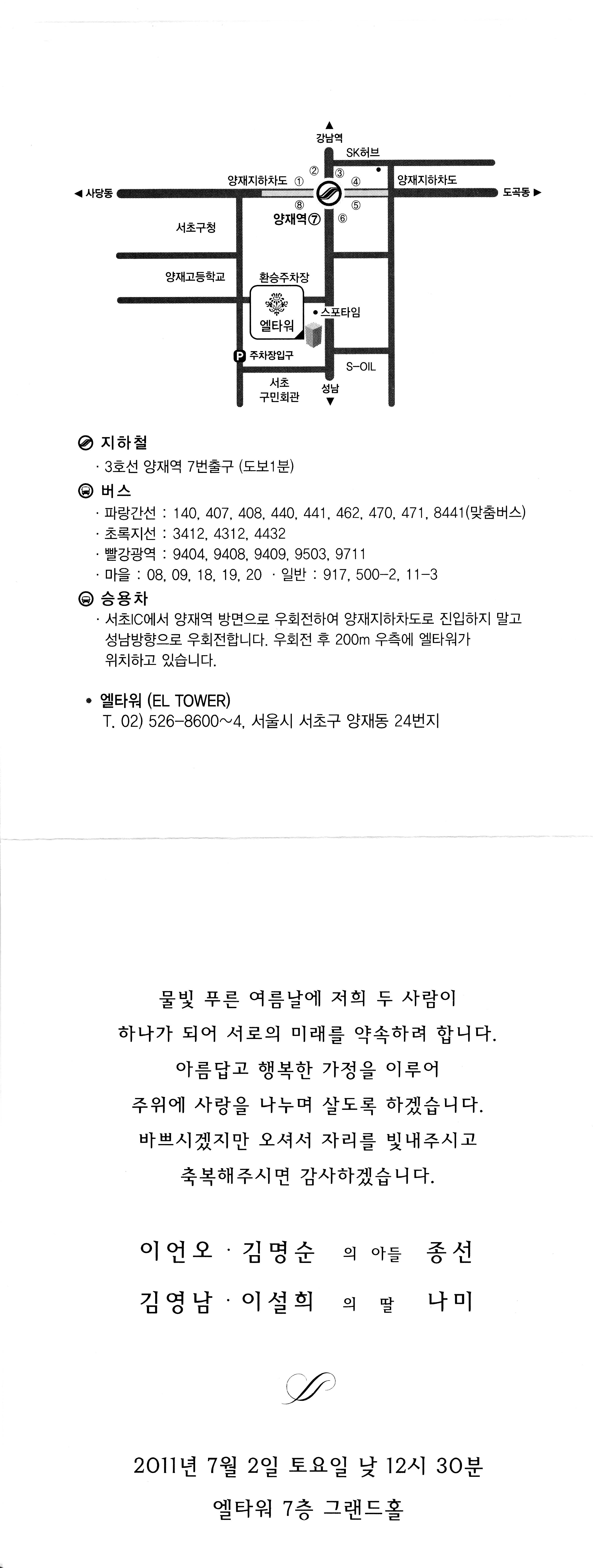 우리학회 종신회원이신 (주)동명기술공단 김영남 부사장님의 자녀 결혼식이 아래와 같이 있어 안내해 드립니다.* 일 시 : 2011년 7월 2일 (토) 낮12시30* 장 소 : 엘타워 7층 그랜드홀(서울 서초구 양재동) 첨부. 청첩장 끝.