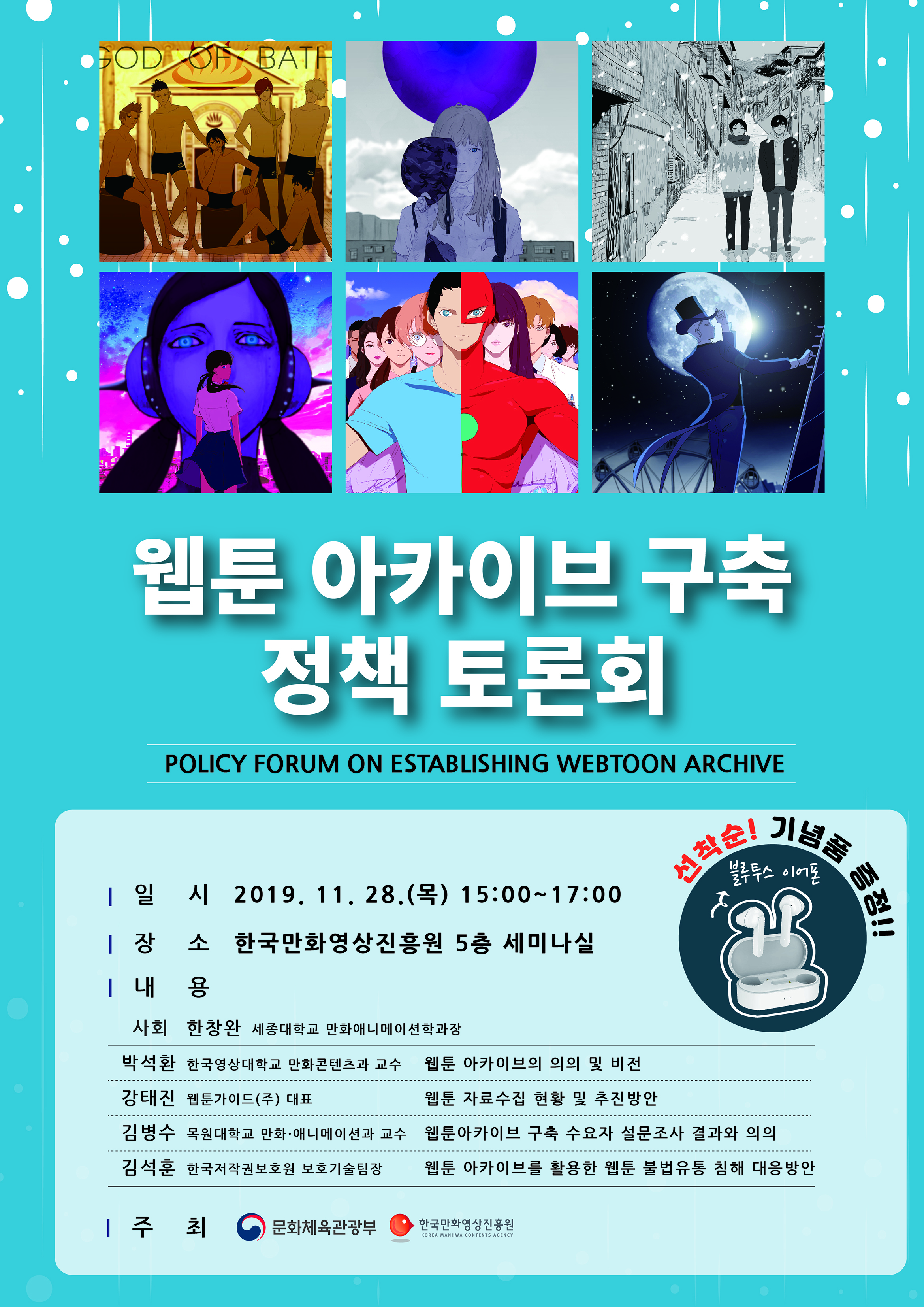 웹툰 아카이브의 방향성과 정책 수립에 관한 의견수렴을 위한 토론회를 11.28.(목)에 개최하게 되어