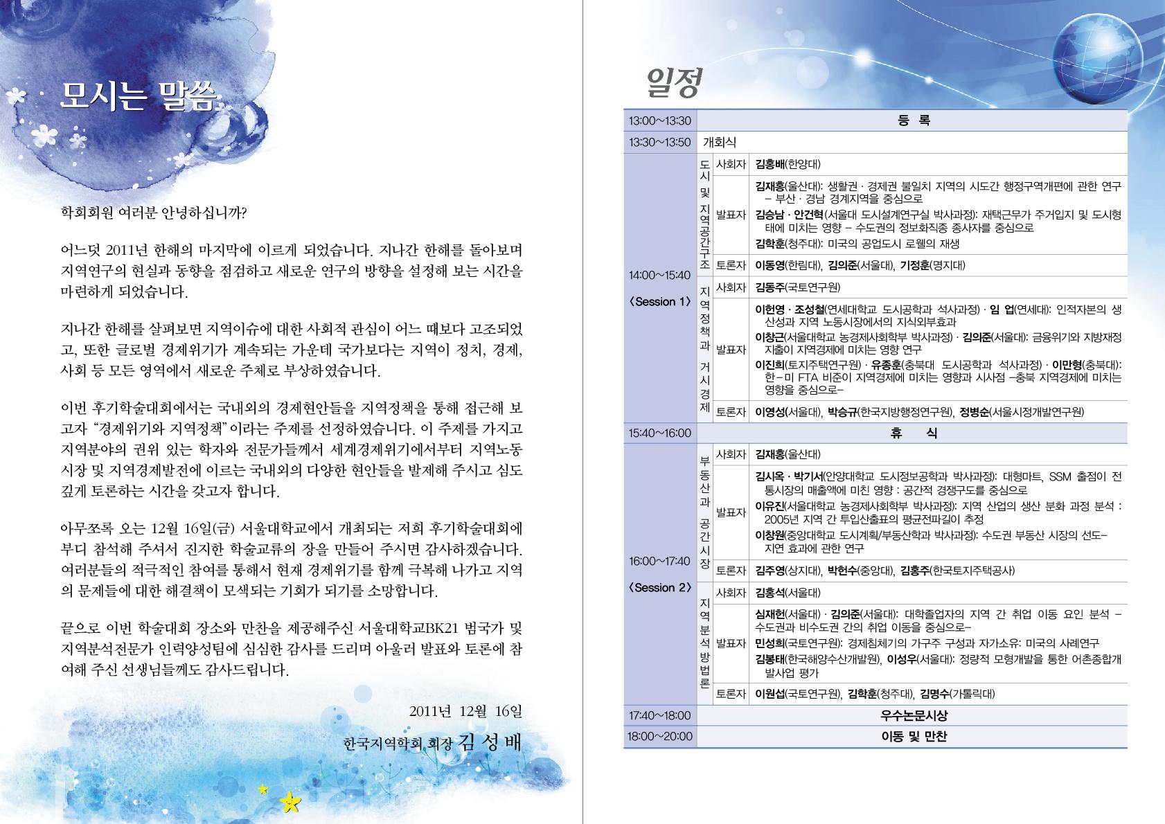 2011년 한국지역학회 후기학술대회 안내