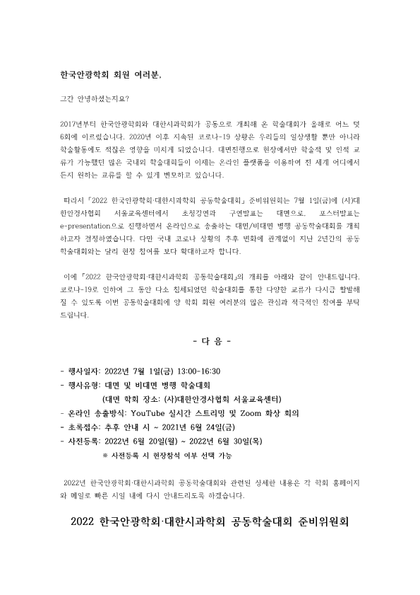 2022년 한국안광학회·대한시과학회 공동학술대회와 관련된 상세한 내용은 각 학회 홈페이지와 메일로 빠른 시일 내에 다시 안내드리도록 하겠습니다.
