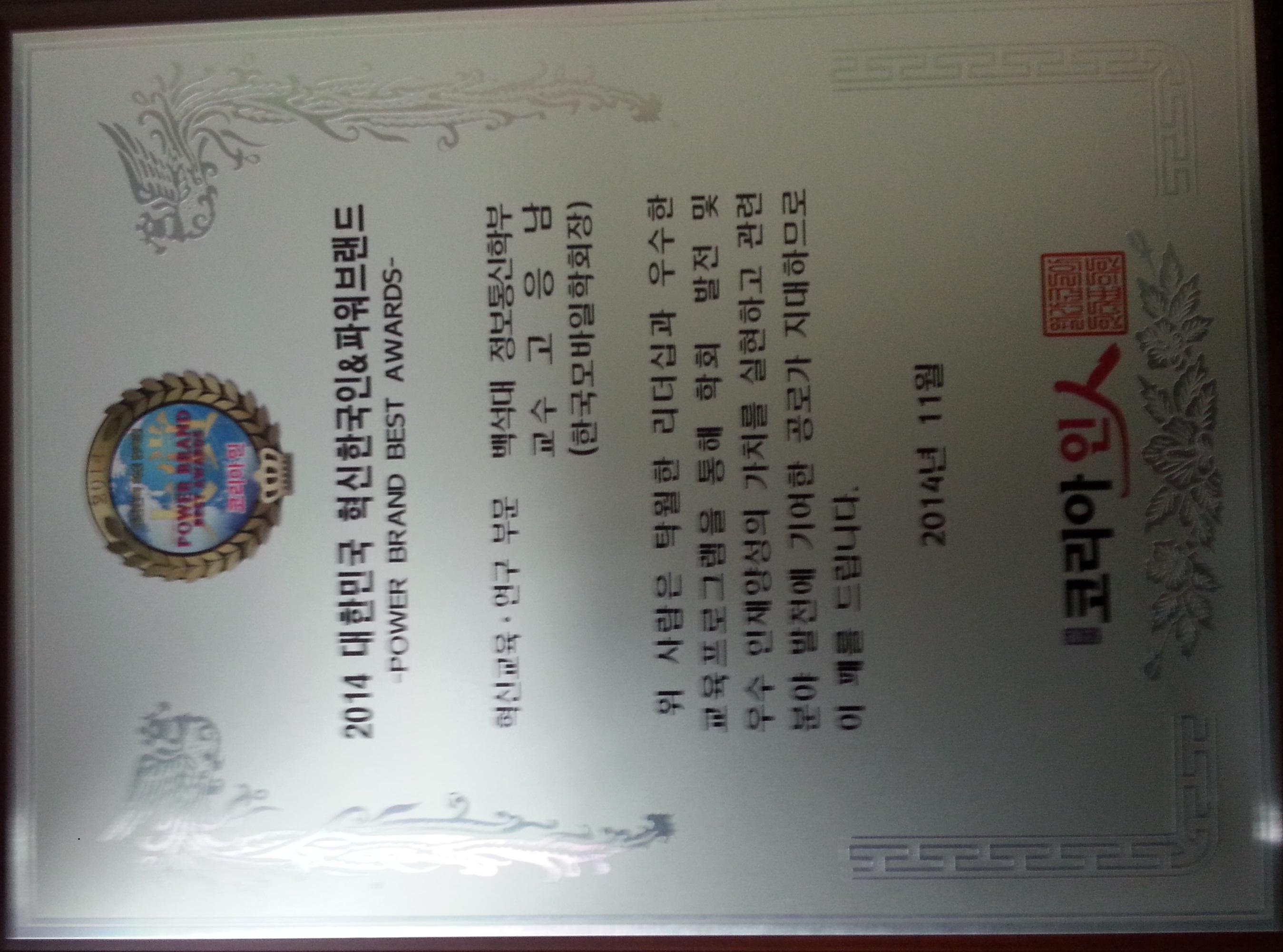 백석대학교 고응남교수님께서 2014년 대학민국 혁신한국인&파워브랜드 혁신교육,연구부분에서 수상을 하게 되었습니다.