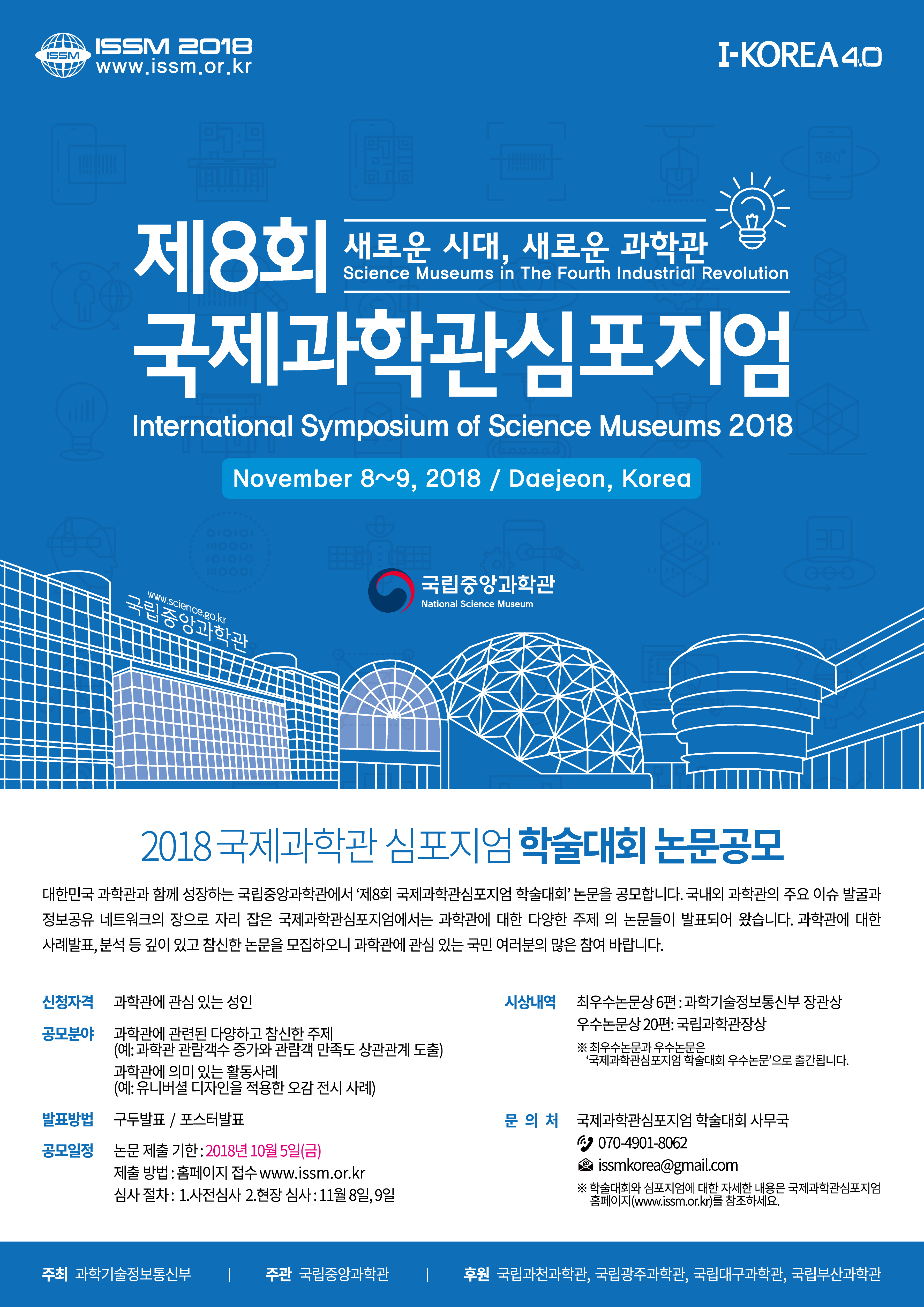 ISSM 2018은 국립중앙과학관에서 주관하여 올해로 제 8회를 맞이하는 국제과학관심포지엄으로 Nina Simon (참여형 박물관 저자), Noah Roford 등의 저명한 인물들의 기조강연 및 국내외 과학관 관련 전문가 들의 강연, 발표 등이 진행되며 ‘새로운 시대, 새로운 과학관’을 주제로 이야기 나누려 합니다. 4차 산업혁명으로 일컬어지는 거대한 변화 속에서 과학관들이 현재 무엇을 해야 하는지, 앞으로 무엇을 해야 하는지에 대한 내용이 다루어질 예정입니다. 이에 역량있는 연구자, 전문가분들의 많은 참여 부탁드립니다.