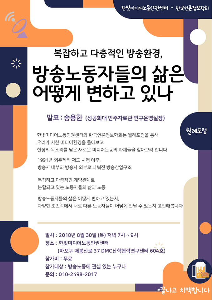 2. 한국언론정보학회에서는 올 6월 연구협약을 맺은 (사)한빛재단의 한빛미디어노동인권센터와 함께 방송산업 비정규직 노동자들의 노동실태와 미디어 환경의 변화를 점검하고 새로운 미디어 노동운동의 전망을 찾고자 아래와 같이 월례포럼을 시작합니다.