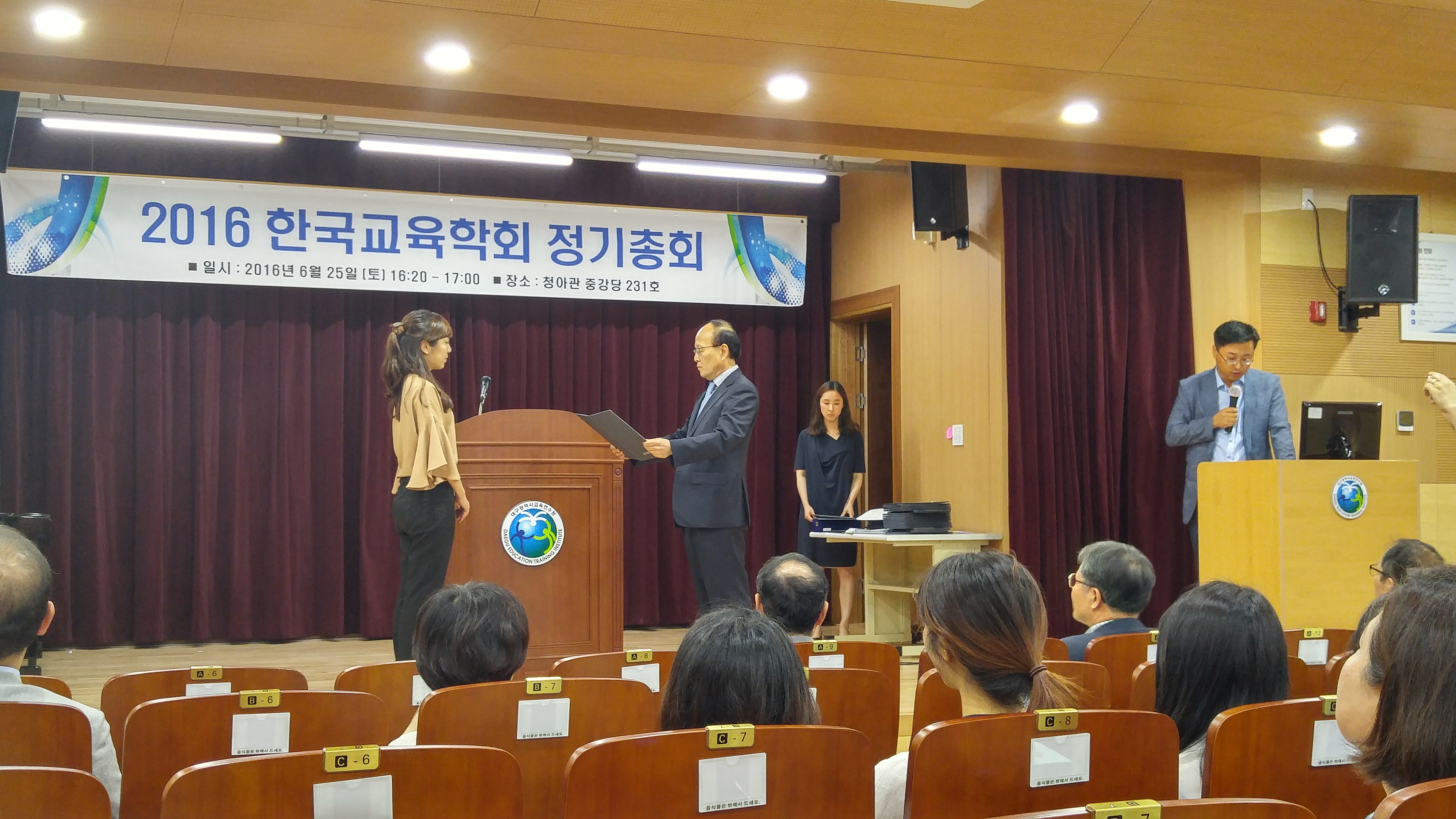 안녕하세요, 총무보조간사 장아름입니다. 한국교육행정학회의 회원이신 김한나 회원께서 지난 24일(금)과 25일(토)에 개최된 한국교육학회 연차학술대회에서 교육학 박사학위 우수논문상을 수상하였습니다. 김한나 회원은 작년 2015년 8월에 박사학위논문 '초등학교 자체평가 도구 개발 연구'를 제출하여 박사학위를 취득하였으며, 한국교육행정학회로부터 교육학 박사학위 우수논문 후보자로 추천되어 최종 선정되었습니다. 이 자리를 빌려 다시 한 번 축하드린다는 말씀 전합니다.