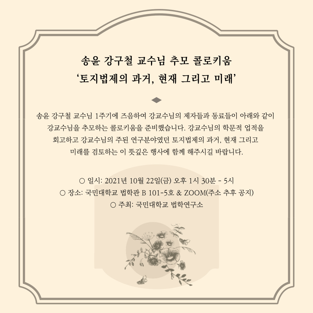 [국민대학교 법학연구소] 송윤 강구철 교수님 추모 콜로키움 <토지법제의 과거, 현재 그리고 미래> 안내