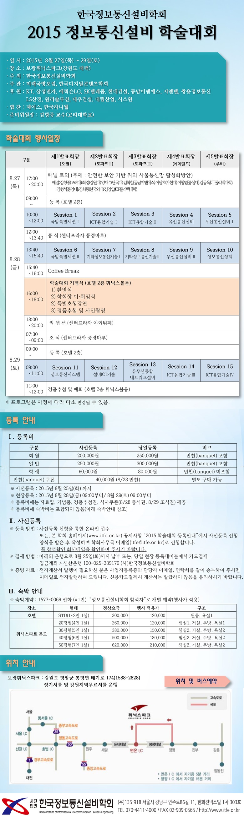 우리학회가 주관하는 '2015 정보통신설비 하계학술대회'에 대한 일정이 나왔습니다. 학회회원께서는 많은 참여를 부탁드립니다. 8월 27일(목) ~ 29일(토) 보광휘닉스파크(강원도 평창)에서 진행되는 '2015 정보통신설비 학술대회' 사전등록을 아래와 같이 공고합니다. 관련기업 및 기관을 포함, 아울러 관심 있는 모든 분들의 적극적 참여와 협조를 부탁 드립니다. 자세한 내용은 'ITFE_2015 정보통신설비 학술대회 행사안내_V1.pdf' 파일을 참고하여 주시기 바랍니다. -아 래- 1. 사전등록기간 : 2015년 8월 25일(화) 까지 2. 등록 방법 : 사전등록 바로가기 http://goo.gl/forms/7wGvRvbHLR 온라인 접수. 또는, 첨부된 사전등록 신청양식을 작성하여 학회사무국 이메일(itfe@itfe.or.kr)로 신청합니다 (신청서약식은 본 학회 홈페이지(www.itfe.or.kr) 공지사항 “2015 학술대회 등록안내” 에서 다운로드 받을 수 있습니다.) 사전등록 신청 후 참석확인 회신메일을 확인하여 주시기 바랍니다. 3. 결제 방법 : 아래의 은행으로 8월 25일(화)까지 납부 또는, 당일 현장 등록테이블에서 카드결제 입금계좌 > 신한은행 100-025-389176 (사)한국정보통신설비학회 4. 행사문의 : 오현정 (070-4411-4000, itfe@itfe.or.kr)