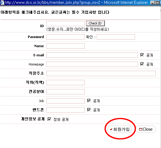 온라인 가입신청은 다음과 같습니다. 1. 학회 홈피의 왼쪽 상단에 회원가입을 클릭합니다 2. 클릭하시면 가입신청 창이 열리며 원하시는 아이디와 패스워드 그리고 정보를 입력합니다 3. 하단의 회원가입 버튼을 클릭 하시면 됩니다 * 굵은 글씨는 필수기입 사항으로 필히 입력하셔야 회원가입 신청이 완료됩니다 회원가입시 문의 사항은 학회로 전화주시면 감사드리겠습니다