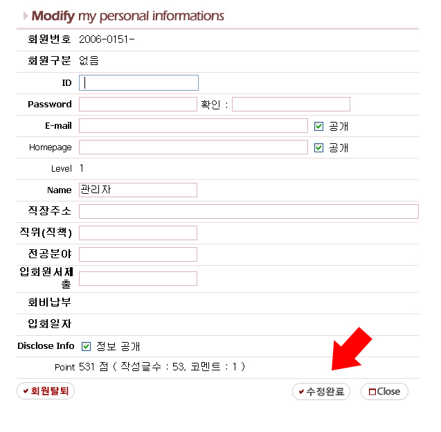 ID 와 패스워드, 개인정보의 변경안내입니다