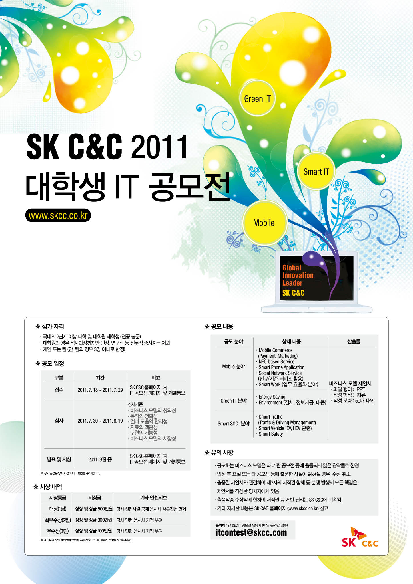 접수 2011. 7. 18 ~ 2011. 7. 29 SK C&C 홈페이지內 IT공모전 페이지