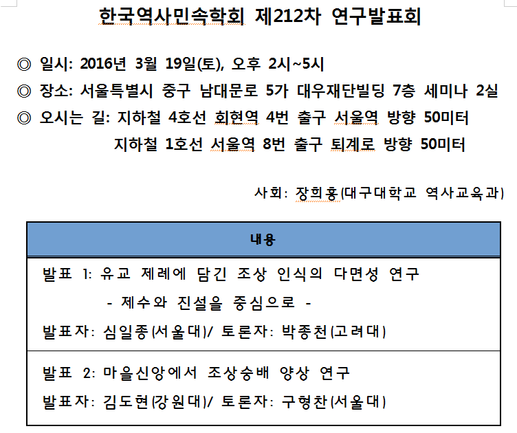 한국역사민속학회 제212차 연구발표회