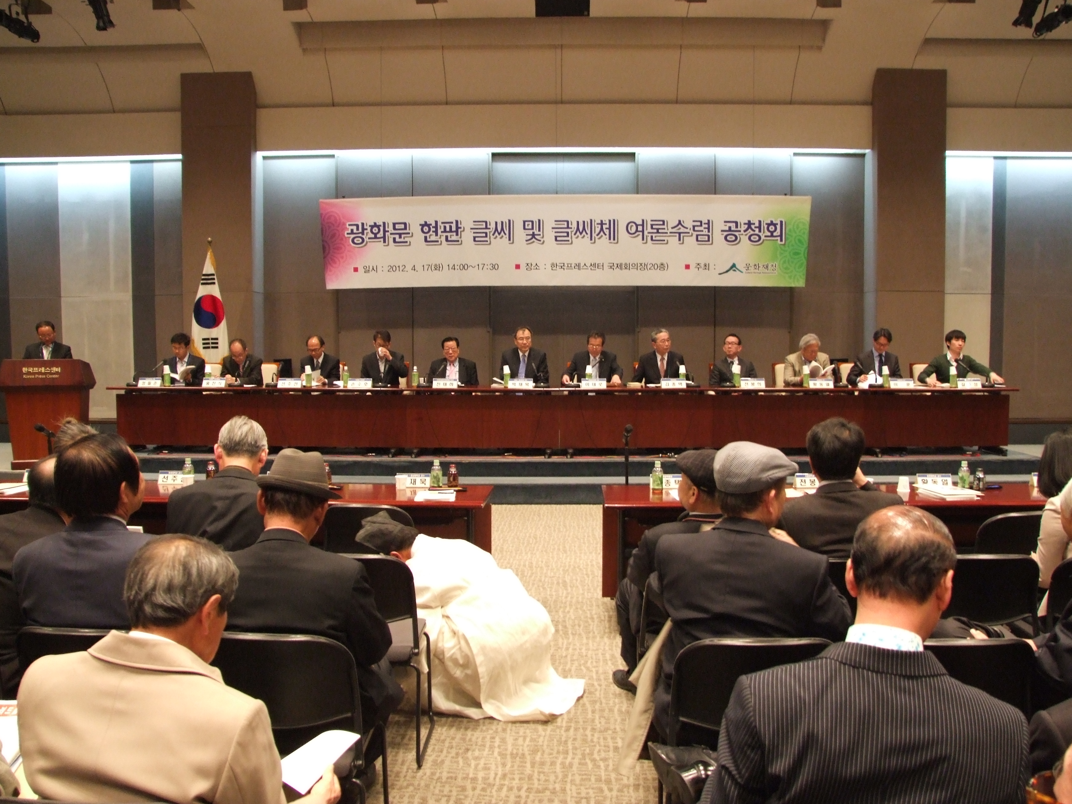 2012년 4월 17일(화) 오후 2시부터 문화재청 주관으로 한국프레스센터 국제회의장에서 열린 '광화문 현판 글씨 및 글씨체 여론 수렴 공청회' 자리에 참석한 발표자와 토론자들의 모습.