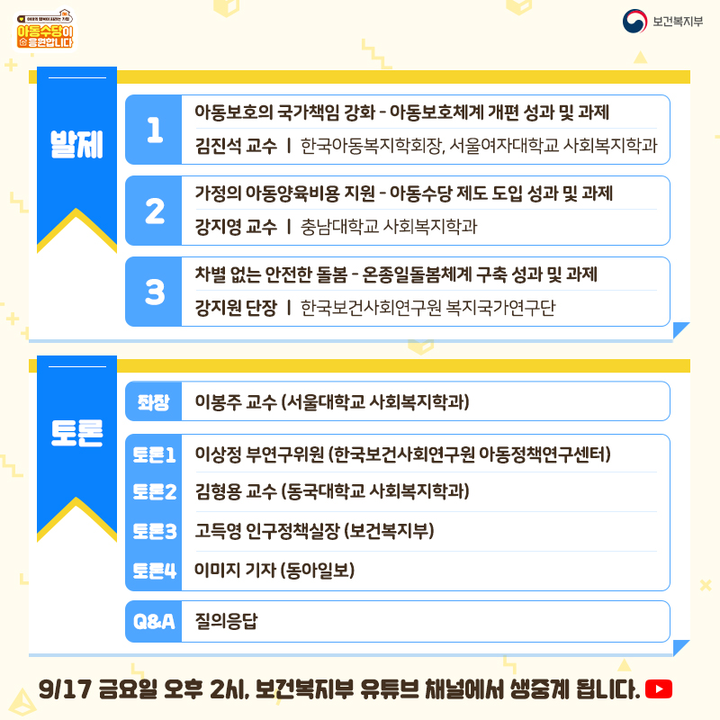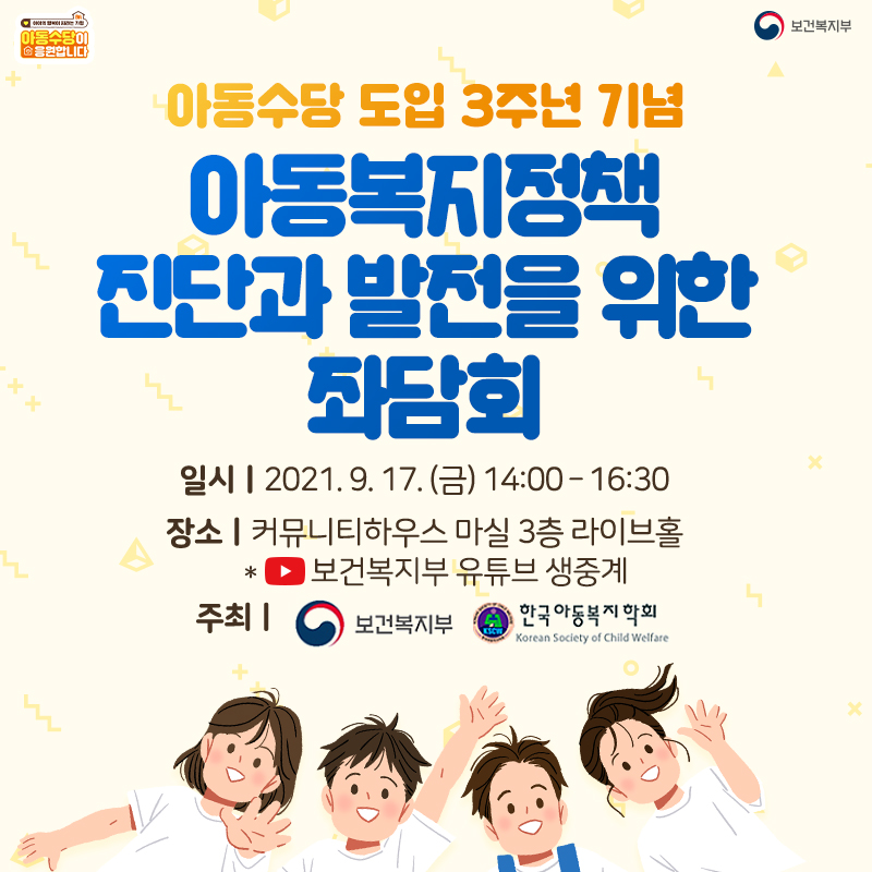 아동복지정책 진단과 발전을 위한 좌담회가 9월 17일 오후 2시에 개최됩니다.