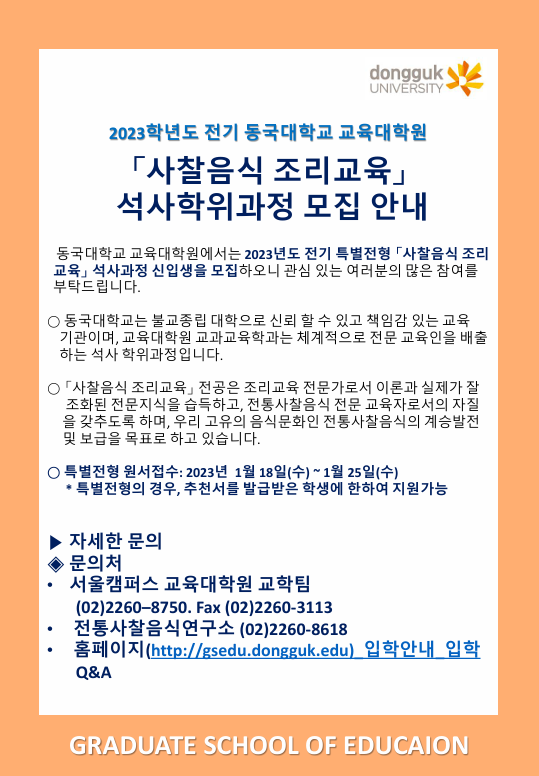 [동국대학교 교육대학원] 사찰음식 조리교육 석사학위과정 신입생 모집