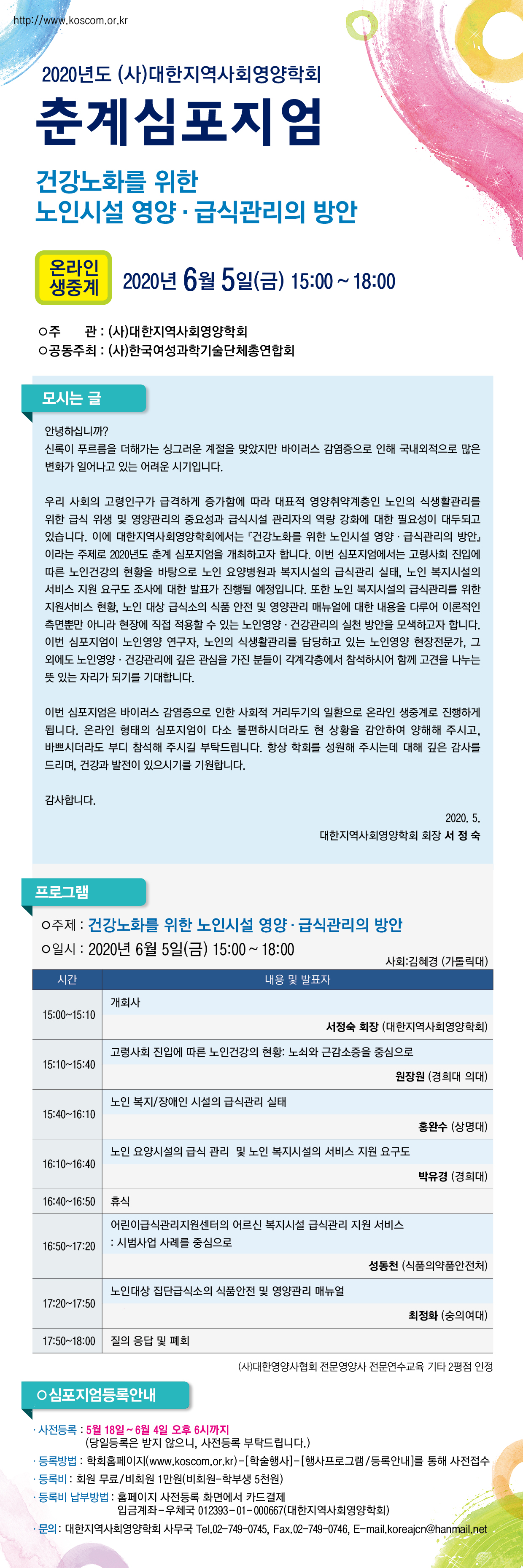 대한지역사회영양학회 홈페이지(www.koscom.or.kr)-[학술행사]-[행사프로그램/등록안내]에서 사전접수