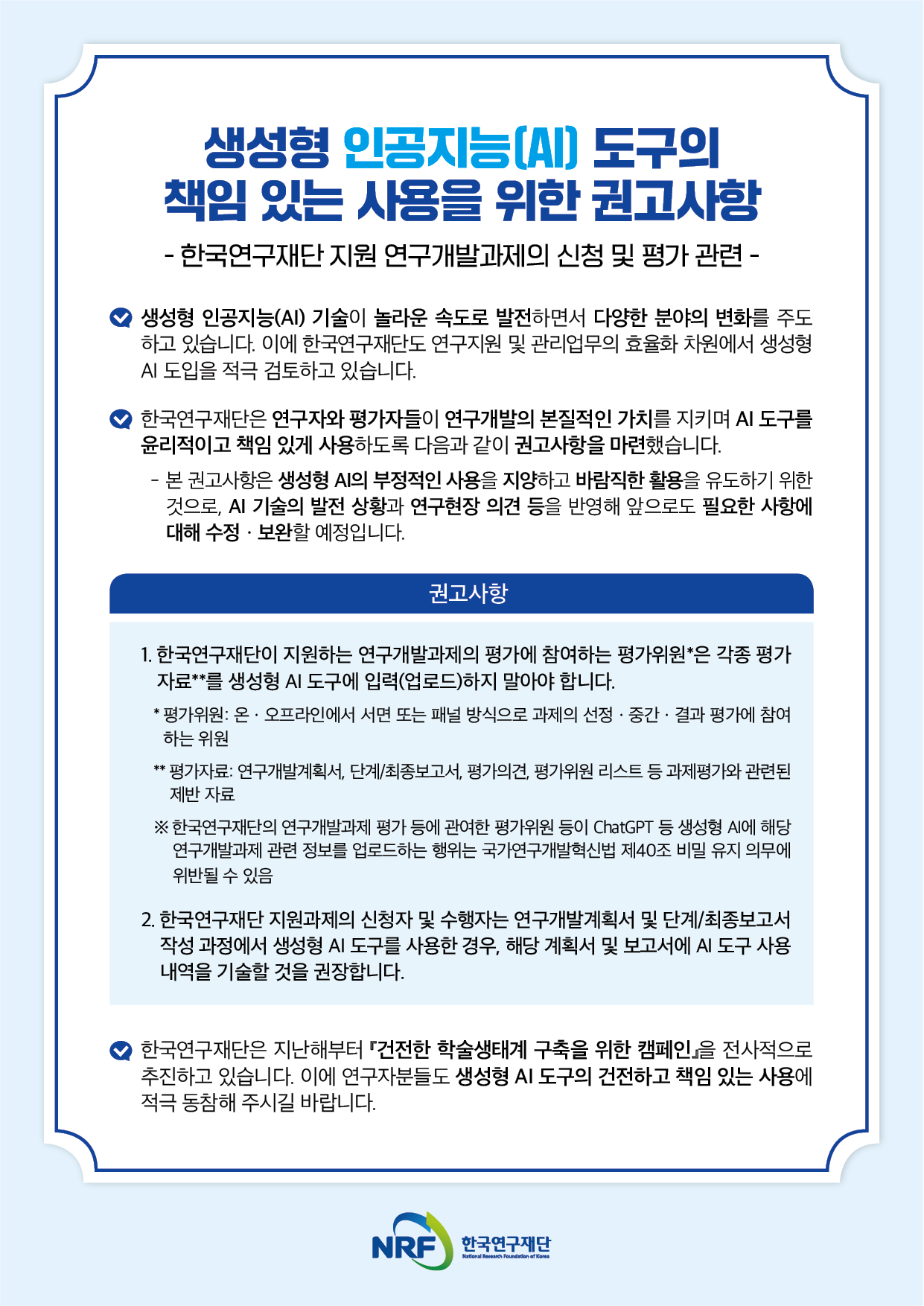 [한국연구재단] 생성형 인공지능(AI) 도구의 책임 있는 사용을 위한 권고사항 안내