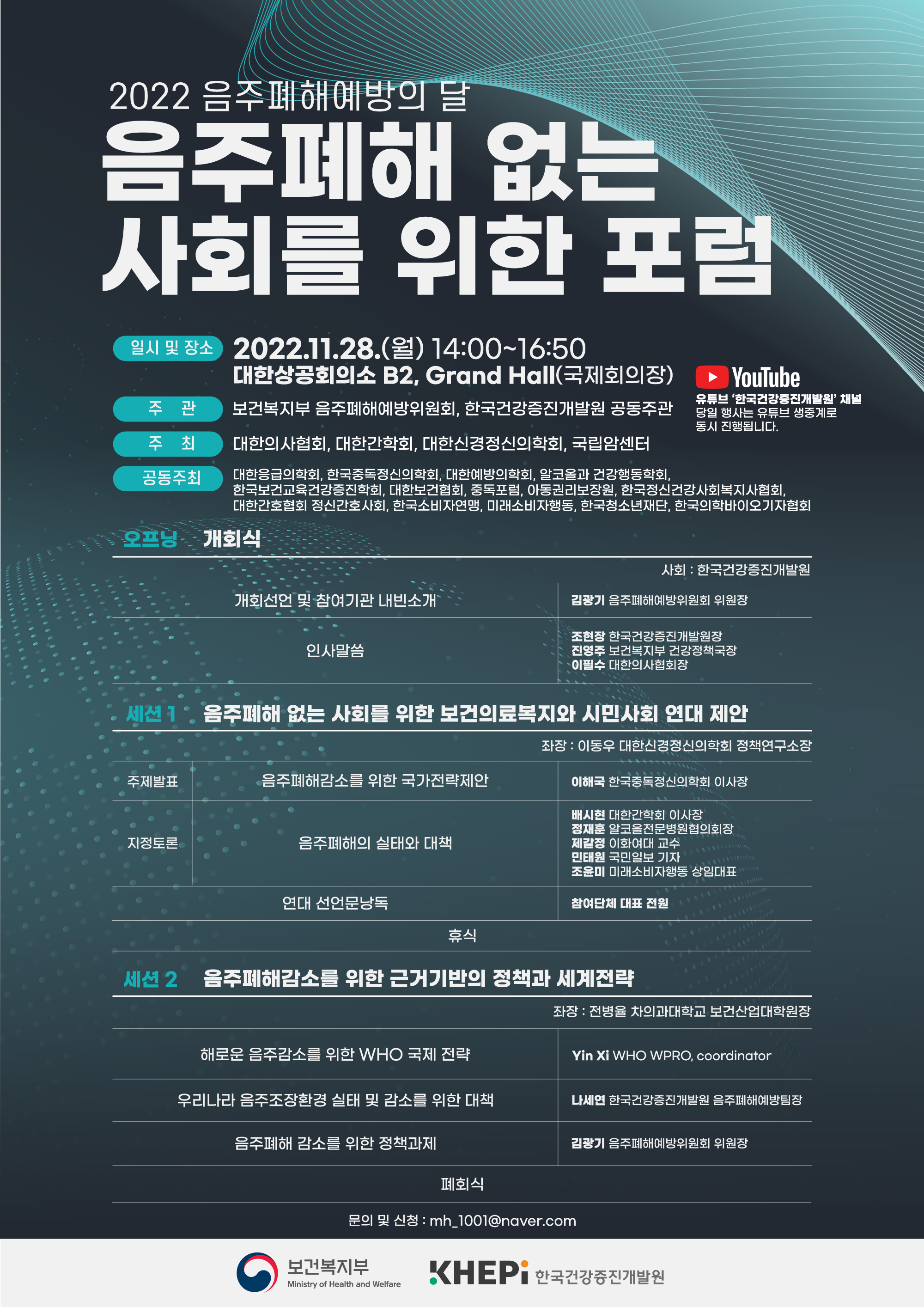 ◯ 공동주최 : 대한응급의학회, 한국중독정신의학회, 대한예방의학회, 한국역학회, 알코올과 건강행동학회, 한국보건교육건강증진학회, 대한보건협회, 중독포럼, 아동권리보장원, 한국정신건강사회복지사협회, 대한간호협회 정신간호사회, 한국소비자연맹, 미래소비자행동, 한국청소년재단, 한국의학바이오기자협회