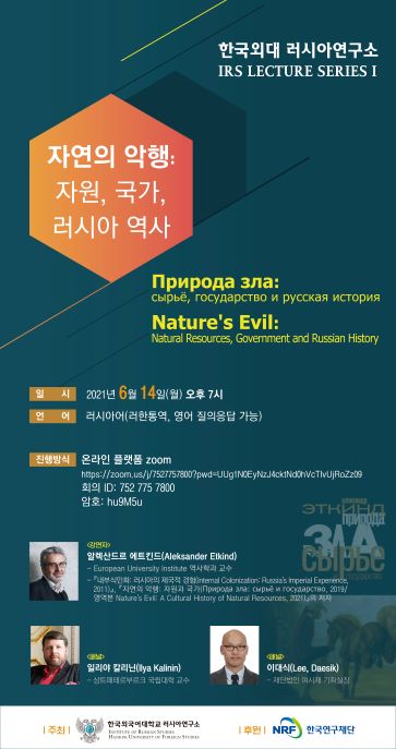 한국외대 러시아연구소 (소장 표상용 교수 )는 국내외 석학을 초청하여 그들의 신간 서적을 중심으로 러시아 문화의 첨예한 이슈들을 논의하는  IRS LECTURE SERIES를 시작합니다 첫 강의에서는  <내부식민화 러시아의 제국적 경험 (2011)>이라는 책으로도 잘 알려진  European University Institute의 역사학자 알렉산드르 에트킨드를 초청하여 그가  2019년 출간한 책  <자연의 악행 자원과 국가  Природа зла сырьё и государство >를 중심으로 러시아 문화사의 적극적 행위자 (agent)로서의 자원의 문제를 살펴보는 시간을 마련하였습니다 이 책은 이번 달  Nature's Evil: A Cultural History of Natural Resources라는 제목의 영역본 출간을 앞두고 있습니다 .