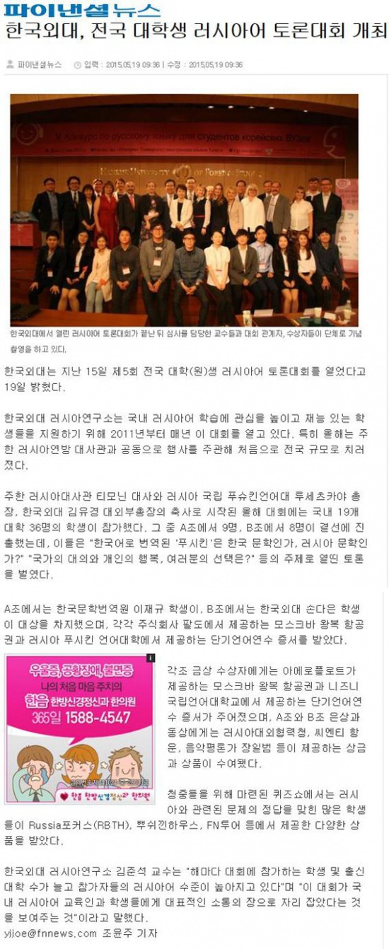 2015년 5월 15일 한국외대 서울캠퍼스 미네르바 콤플렉스 국제회의실에서 제5회 전국 대학(원)생 러시아어 토론대회가 개최되었다.