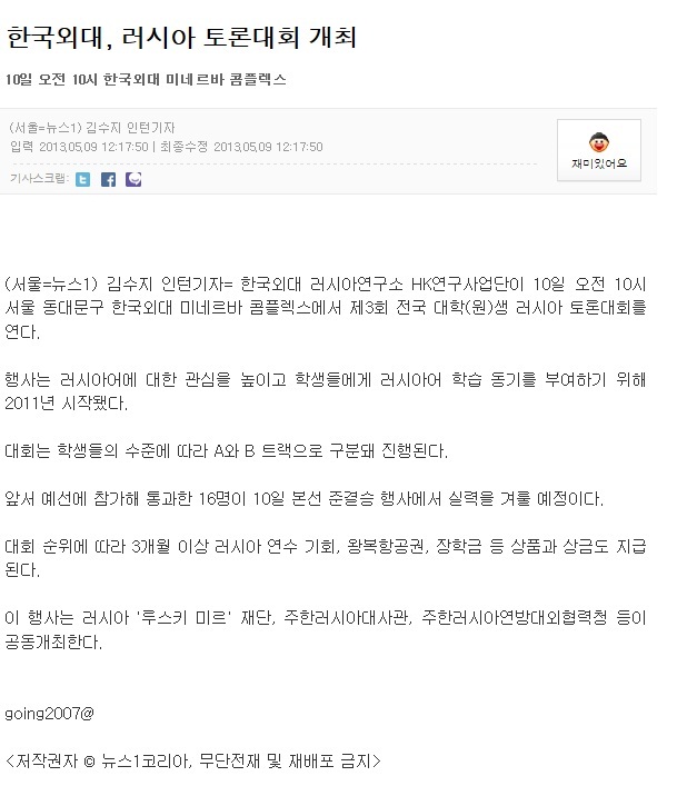 2013년 5월 10일(금) 한국외대 서울캠퍼스 미네르바 콤플렉스에서 러시아연구소(소장 홍완석 교수) HK연구사업단은 러시아 루스키 미르 재단 및 주한 러시아대사관, 주한 러시아연방 대외협력청과 공동으로 제3회 전국 대학(원)생 러시아어 토론대회를 개최했다. 전국 대학에서 신청한 응모자들을 대상으로 사전 예선을 거쳐 이번 토론대회에는 본선 진출자 16명이 최종 참가했다.
