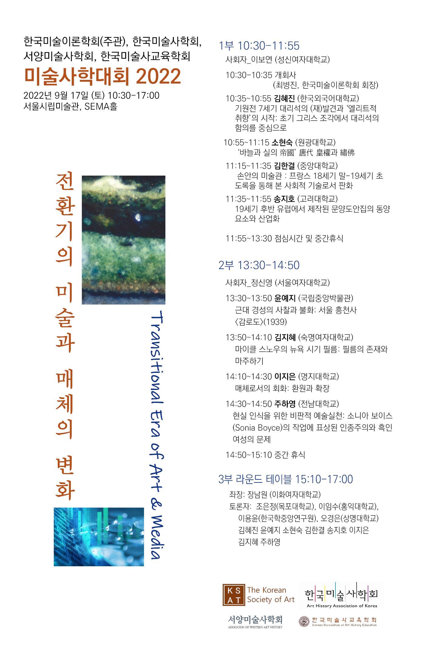 한국미술이론학회가 주관하고 서양미술사학회, 한국미술사학회, 한국미술사교육학회가 공동으로 주최하는  2022 미술사학대회가 9월 17일(토) 개최됩니다.