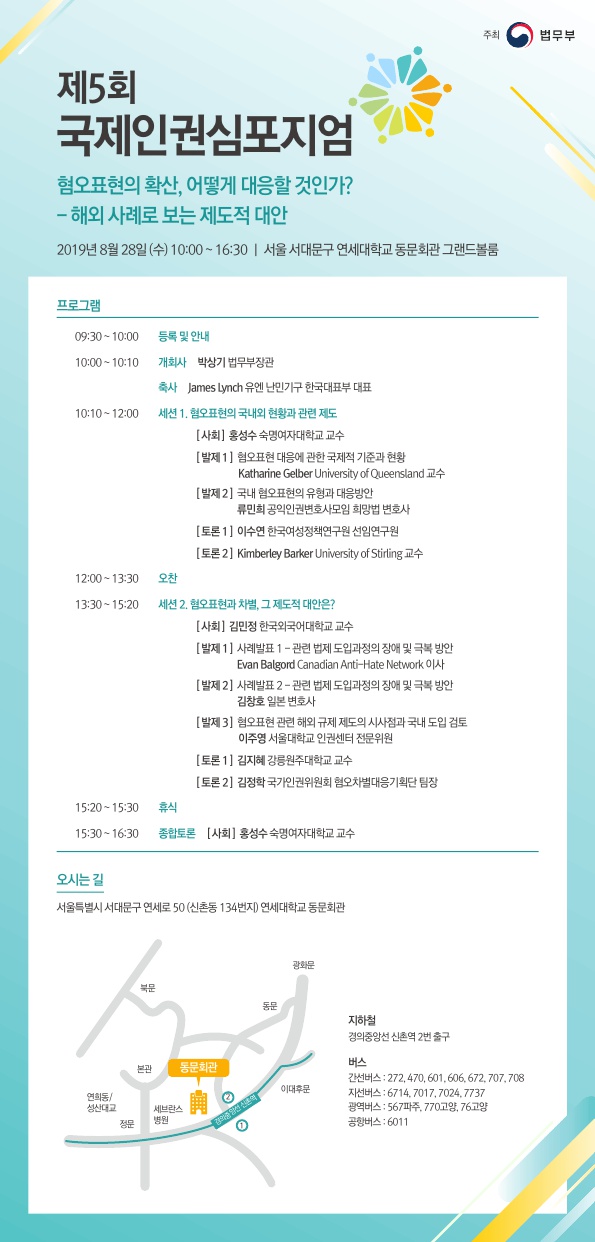 법무부는 제5회 국제인권심포지엄을 개최하여 국-내외 전문가를 초청하고 혐오표현 규제의 대응현황과 우리나라의 혐오표현에 대한 법적-제도적 대안을 논의하고자 합니다.