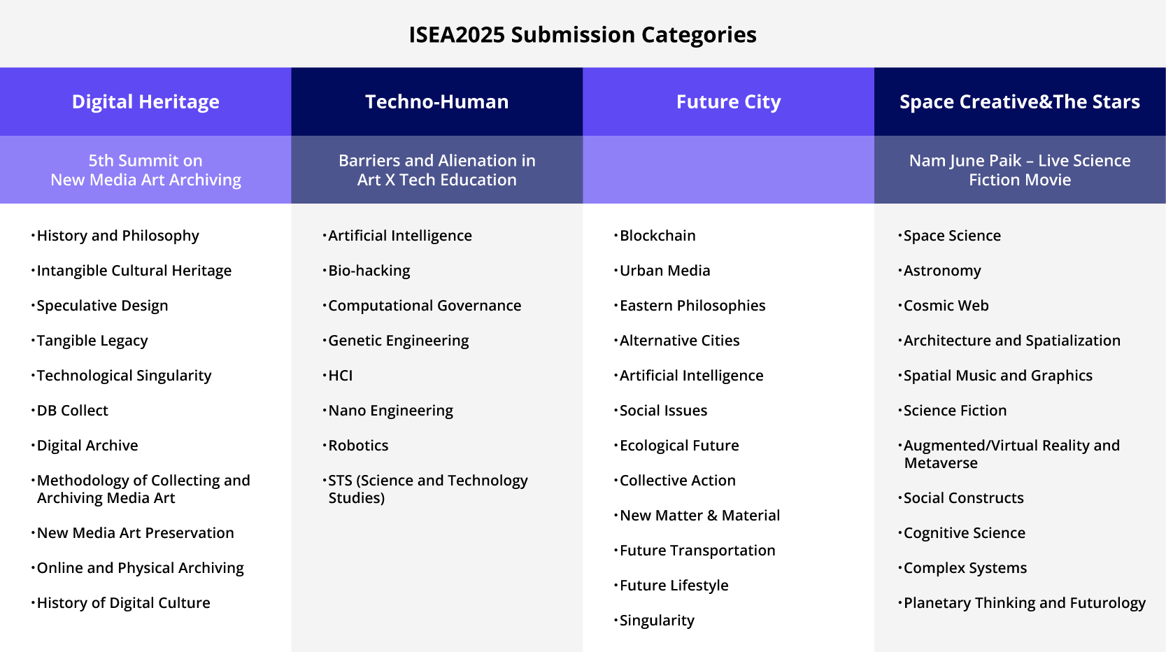 Introducing the four sub-themes for ISEA2025 academic submissions.