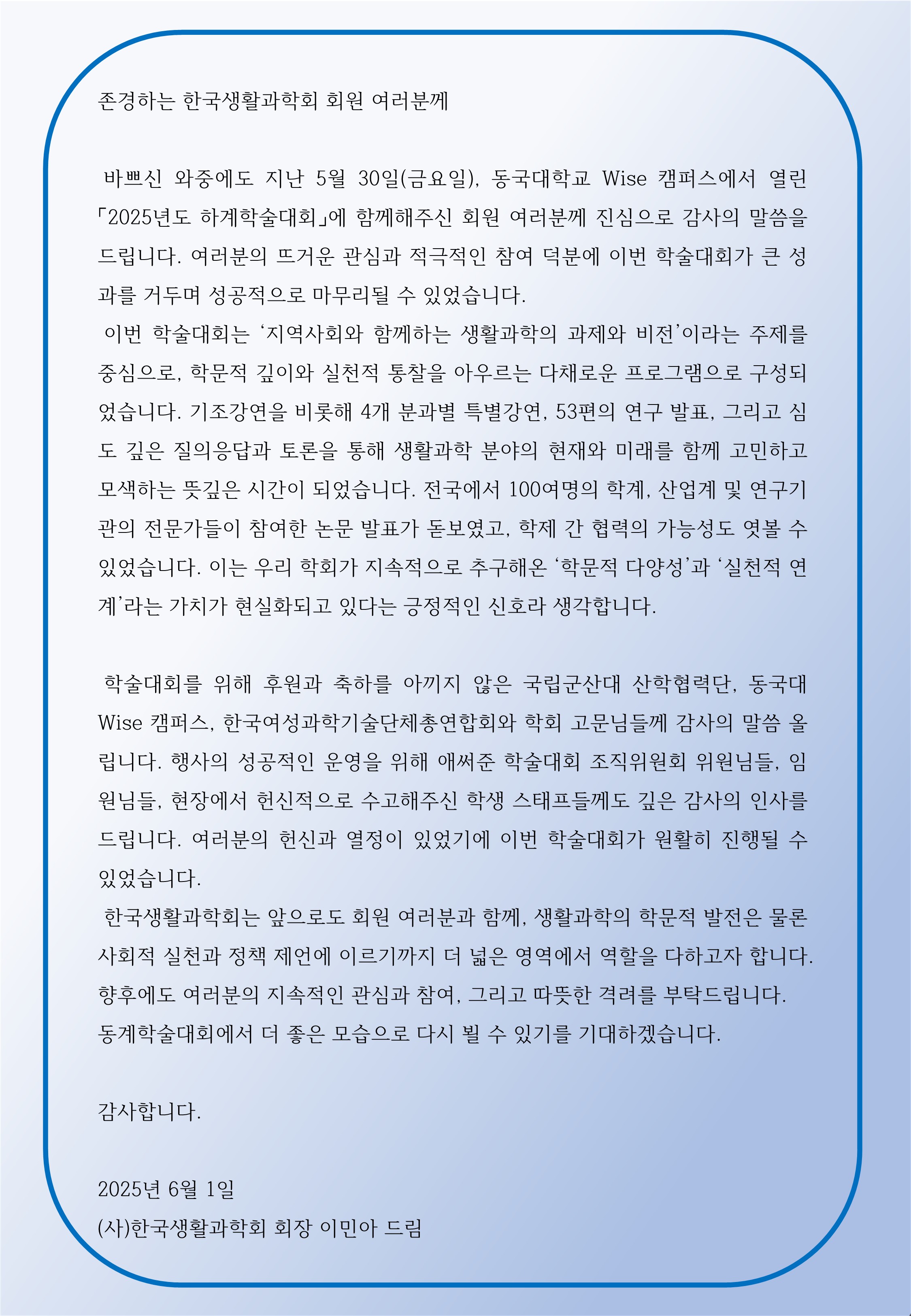 2025년도 (사)한국생활과학회 하계학술대회 성료 감사 인사