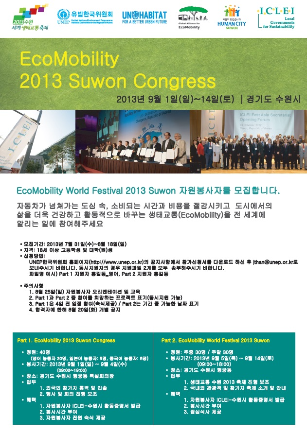 EcoMobility World Festival 2013 Suwon 자원봉사자를 모집합니다. 자동차가 넘쳐나는 도심 속 출퇴근에 소비되는 시간과 비용을 절감시키고 도시에서의 삶을 더욱 건강하고 활동적으로 바꾸고자 대중교통과 자전거, 걷기의 효율적인 연계를 추구하는 생태교통(EcoMobility)을 전 세계에 알리는 일에 참여해주세요. • 모집기간: 2013년 7월 31일(수)~8월 18일(일) • 자격: 18세 이상 고등학생 및 대학(원)생 • 신청방법: UNEP한국위원회 홈페이지(http://www.unep.or.kr)의 공지사항에서 참가신청서를 다운로드 하신 후 jthan@unep.or.kr로 보내주시기 바랍니다. 동시지원자의 경우 지원파일 2개를 모두 송부해주시기 바랍니다. 파일명 예시) Part 1 지원자 홍길동_영어, Part 2 지원자 홍길동 • 주의사항 1. 8월 25일(일) 자원봉사자 오리엔테이션 및 교육 2. Part 1과 Part 2 중 참여를 희망하는 프로젝트 표기(동시지원 가능) 3. Part 1은 4일 전 일정 참여(숙식제공) / Part 2는 기간 중 가능한 날짜 표기 4. 합격자에 한해 8월 20일(화) 개별 공지 Part 1. EcoMobility 2013 Suwon Congress • 정원: 40명(영어 능통자 30명, 일본어 능통자: 5명, 중국어 능통자: 5명) • 봉사기간: 2013년 9월 1일(일) ~ 9월 4일(수) (09:00~19:00) • 장소: 경기도 수원시 행궁동 특설회의장 • 업무 1. 외국인 참가자 통역 및 인솔 2. 행사 및 회의 진행 보조 • 혜택 1. 자원봉사자 ICLEI-수원시 활동증명서 발급 2. 봉사시간 부여 3. 자원봉사자 전원 숙식 제공 Part 2. EcoMobility World Festival 2013 Suwon • 정원: 주중 30명 / 주말 30명 • 봉사기간: 2013년 9월 5일(목) ~ 9월 14일(토) (09:00~18:00) • 장소: 경기도 수원시 행궁동 • 업무 1. 생태교통 수원 2013 축제 진행 보조 2. 국내외 관광객 및 참가자 축제 소개 및 안내 • 혜택 1. 자원봉사자 ICLEI-수원시 활동증명서 발급 2. 봉사시간 부여 3. 점심식사 제공
