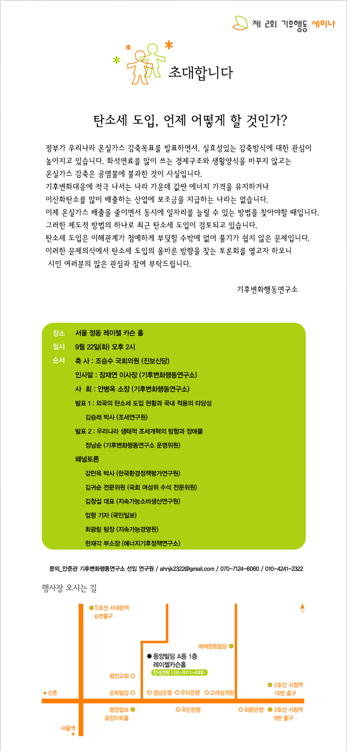 안녕하세요? 기후변화행동연구소입니다. 이번달 22일, 탄소세 도입과 관련한 세미나에 여러분을 초대합니다. 참석을 원하시는 분들은 소속과 이름을 아래의 이메일주소로 보내주시기 바랍니다. (*22일은 서울시 '차 없는 날'입니다. 광화문 일대의 교통이 차단되니 대중교통을 이용해 주시길 부탁드립니다.)