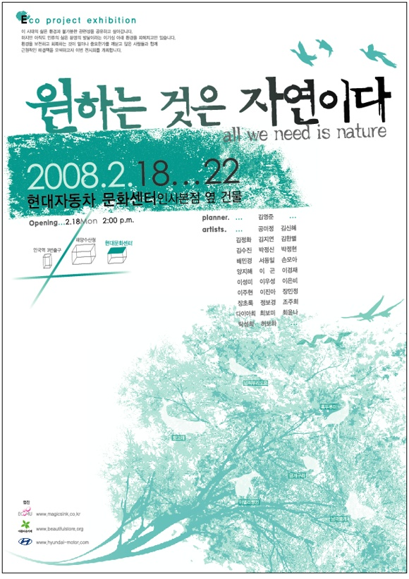 원하는 것은 자연이다 - Eco Project Exhibition - Project 전국 대학생 최초의 Eco Project 전시회입니다. 전국의 다양한 대학교에서 모인 학생들이 환경에 대해 느끼고 생각하는 바를 알리고 그것을 통해 많은 이들과 공감해보자는 취지로 기획하게 되었습니다. About 이 시대의 삶은 환경과 불가분한 관련성을 공유하고 살아갑니다. 그렇기 때문에 인류는 항상 환경을 보전하고 가꾸어 나가는 삶의 자세를 지녀야 합니다. 하지만 아직도 인류의 삶은 문명의 발달이라는 이기심 아래 환경을 파헤치고만 있습니다. 이러한 모습들은 매우 그릇된 삶이라는 걸 아직도 인식하지 못한 채 살아갑니다. 여기 모인 저희도 이처럼 환경을 보전하고 회복하는 것이 얼마나 중요한가를 잘 인식하지 못한 채 살아왔습니다. 다소 늦었지만 저희는 지금이나마 환경을 보전하고 회복하는 것이 얼마나 중요한가를 깨닫게 되었습니다. 그리고 이제 그 중요성을 많은 사람들과 함께 생각해보고 근원적인 해결책을 모색하자는 취지 아래 이번 전시회를 개최하려 합니다. 부디 이번 전시회에 같이 동참해 주셔서 환경을 바라보는 저희들의 다양한 생각들을 한 번 보시고 여러분 스스로도 환경에 대해 한 번 쯤 다시 생각해보는 기회로 삼아주시길 부탁드립니다. Process 이번 전시는 학생들이 순수하게 모든 전시 기획을 맡아 진행합니다. 여러 대학(홍대, 국민대, 건국대, 한성대, 세종대 등...) 미술 관련 전공 학생들이 각자의 환경에 대한 생각을 표현한 작품들을 전시하게 됩니다. 작품들은 다양한 연령층이 모두 직접 보고 생각하고 느낄 수 있도록 진행해 나아가고 있습니다. 특히 이번 전시회는 환경의 근원적인 해결책이 교육이라는 판단 아래 많은 초중고생들이 참여할 수 있는 방안을 마련하고 있습니다. Event 오프닝 행사는 간단한 다과와 함께 환경에 관한 영상물을 보여주는 것으로 시작합니다. 메인이벤트로 중고품 나눠 쓰기 행사를 하려 합니다. 참여자가 직접 안 쓰는 물건들을 내놓고 그 물건들을 전시회 관람객들에게 나눠주는 행사입니다. 무료로 나눠드리는 행사가 아니라 단 돈 백 원이라도 받고 나눠드리는 행사입니다. 이렇게 받은 돈은 전시가 끝 날 때까지 모았다가 환경오염으로 고생하고 있는 태안 주민들을 위해 기부할 것입니다. 특히 참여자뿐만이 아니라 전시를 보러 오시는 많은 분들께서도 직접 안 쓰시는 물건을 기증 하실 수 있습니다. 또 하나의 이벤트로 태안 주민과 태안 지역의 많은 환경 생태계에 편지쓰기 행사를 할 예정입니다. 조그만 쪽지에다가 여러 많은 분들의 말과 글을 담아 직접 태안 주민 분들에게 전해드리는 행사입니다. 아주 어린 아이부터 나이 많으신 분까지 누구나 참여하실 수 있는 자리입니다. Object 환경의 피해를 알리는 그림 / 재활용품을 이용한 제품 / 친환경 소재를 이용한 제품 / 재생 불가능한 소재를 이용한 작품 / 환경의 피해의 심각성을 알리는 영상 / 환경에 관련된 포스터 / 분해 폐기가 간편한 제품 / 움직임을 통해 환경의 중요성을 보여주는 가변작품 등 Place 안국역 3번 출구 100m 방향 현대 문화센터 로비 Period 2008.2.18 ~ 2008.2.22 Time 오전 10:00 ~ 오후 08:00 (18일은 오후 2시 Open) Name 전국 대학생 Eco Project 모임 팀장 국민대학교 공업디자인과 김영준 010-8488-5015 ariasoul@naver.com
